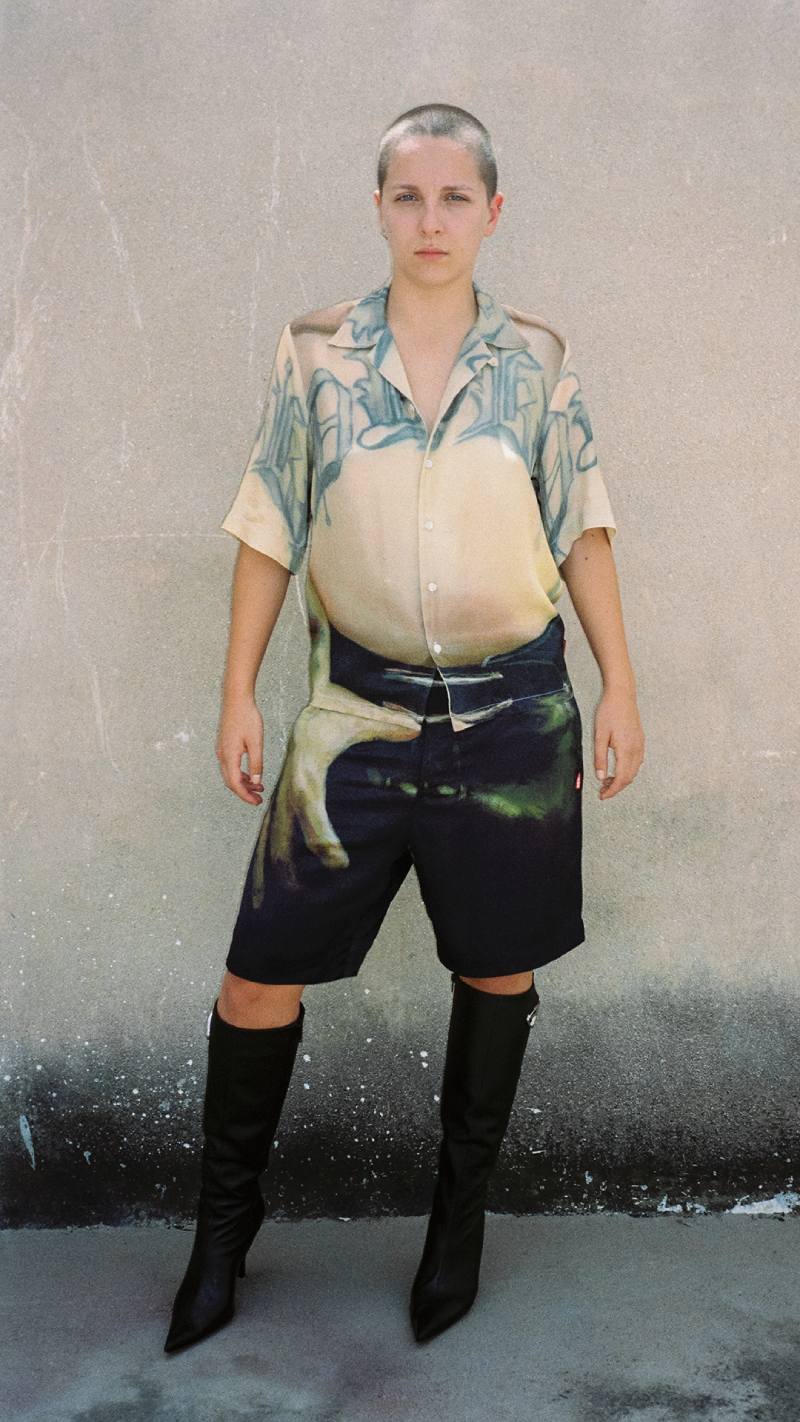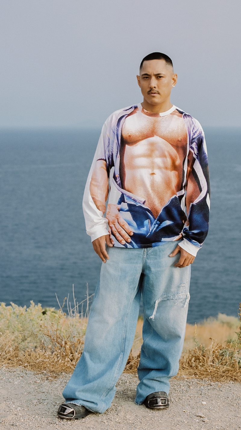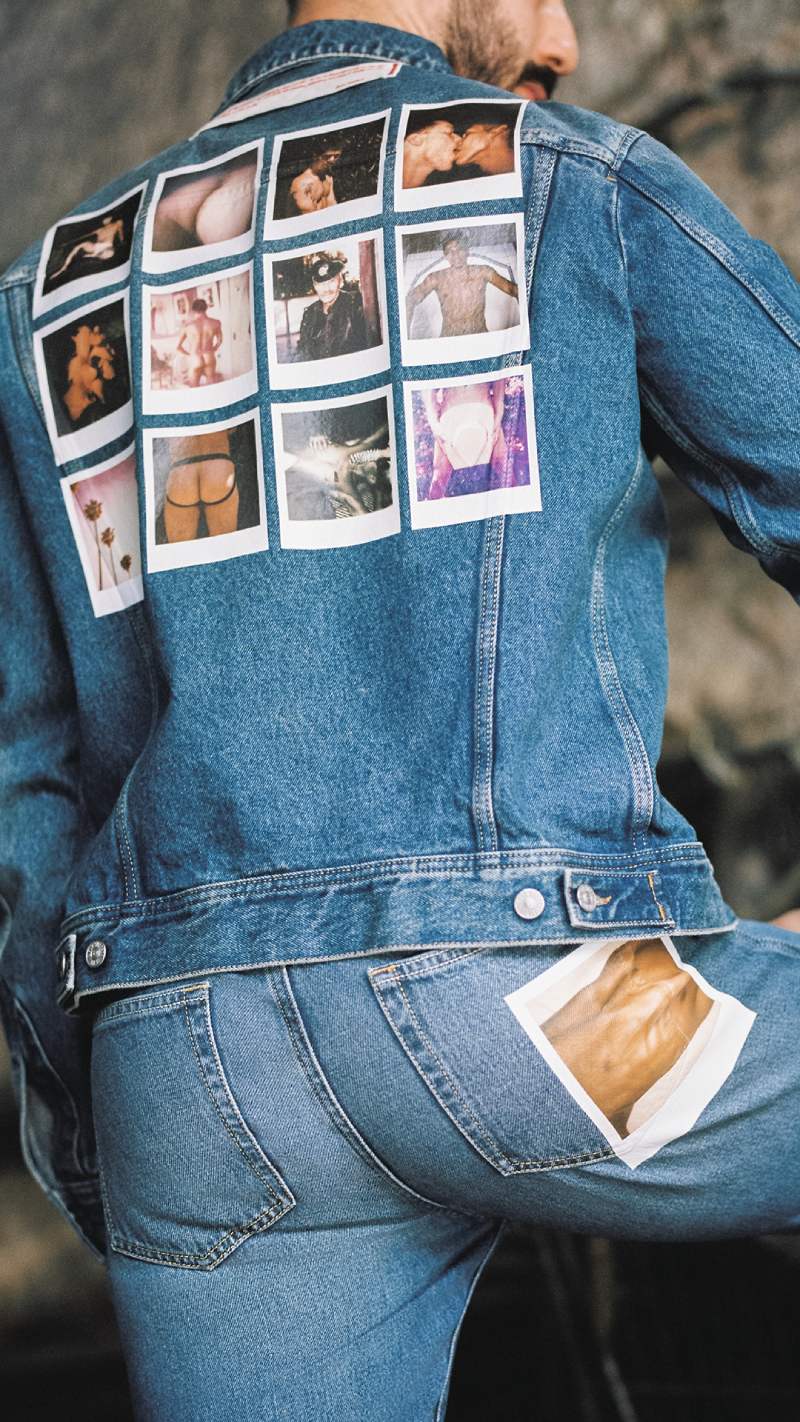 En esta misma línea, Diesel X Tom of Finland 2024 presenta una camisa manga corta y bermudas con un trompe l’oeil de manos sobre cintura de jean acentuado por branding gótico. Y como interpretación más sutil, el conjunto vaquero está estampado, no cosido. Estas dos prendas también se decoran con parches de polaroids eróticas, que vemos también en camisetas y tank tops.