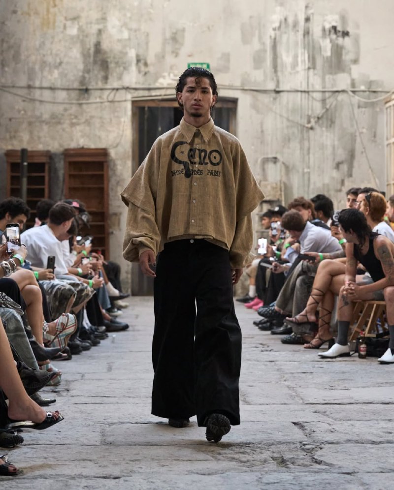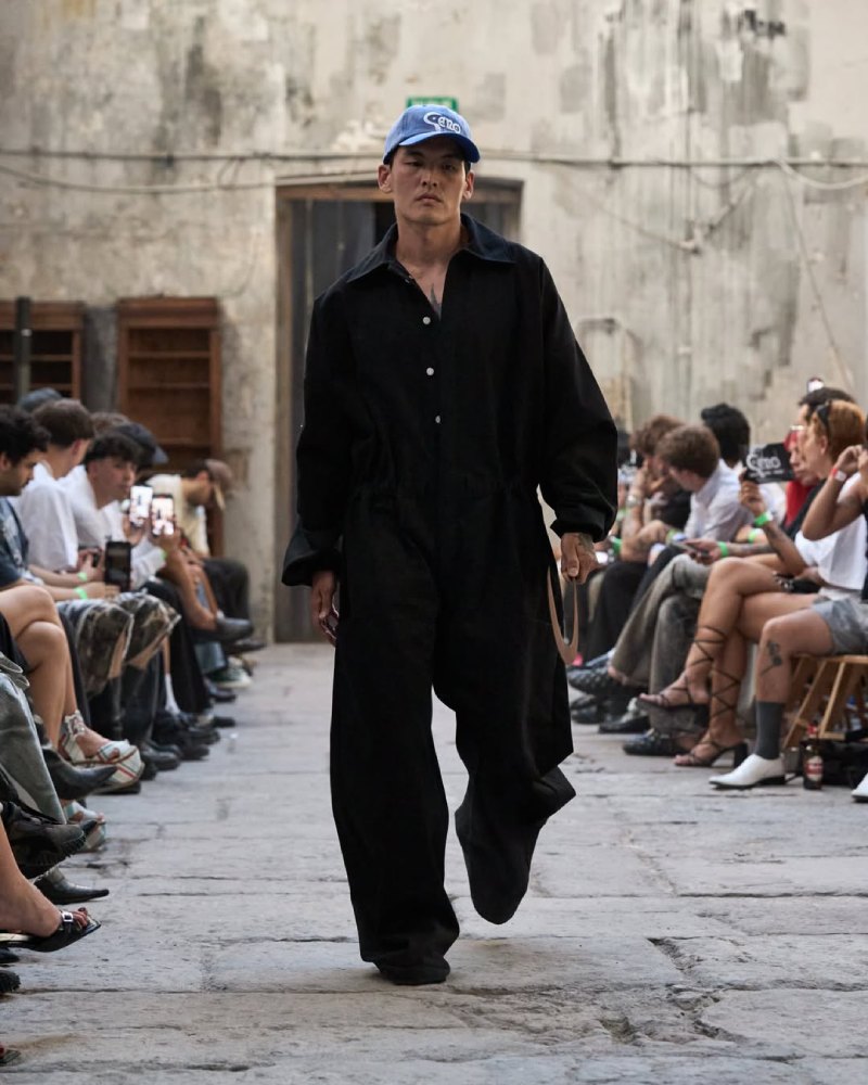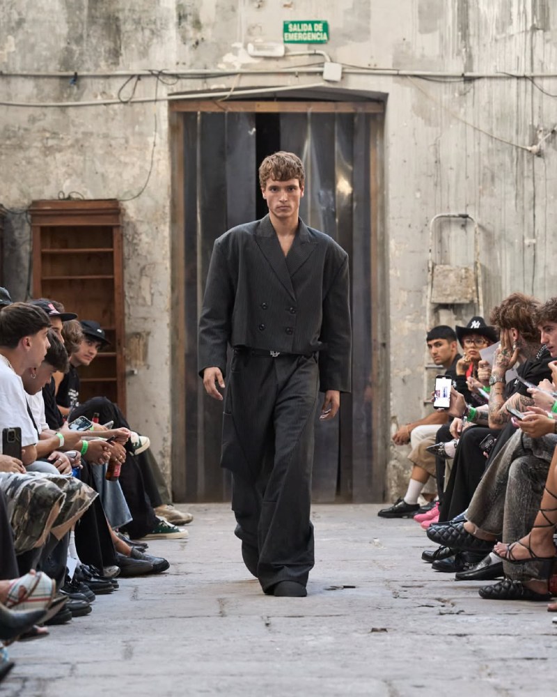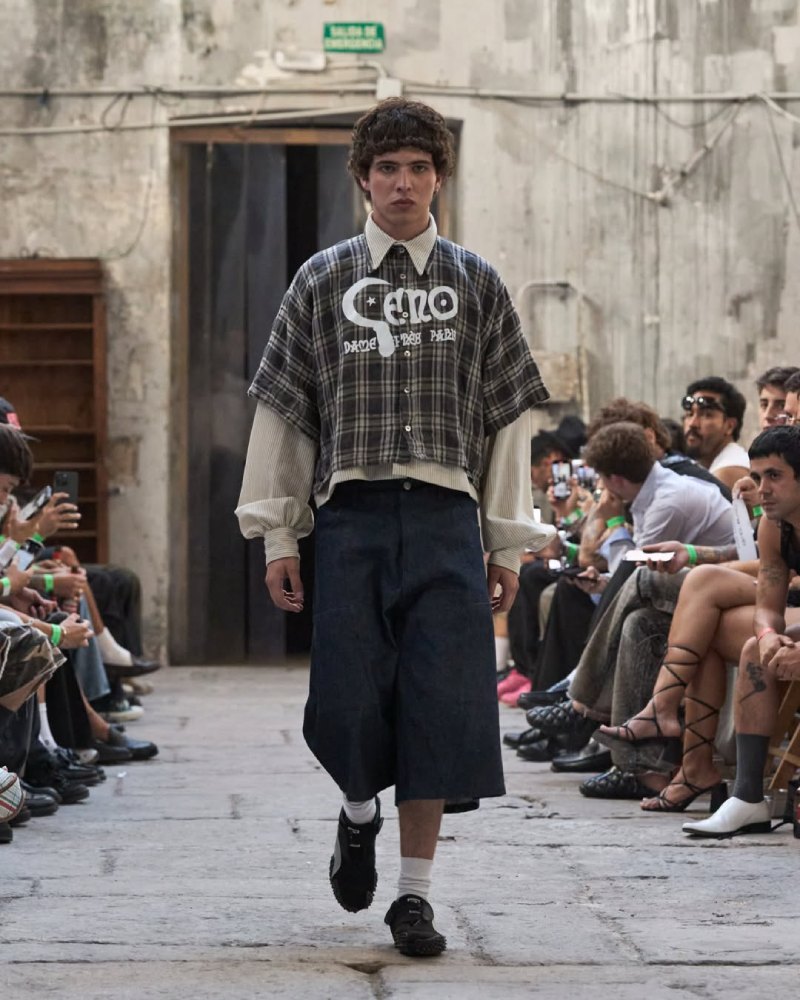 A parte de la cápsula de Dame Après Paris X Puma, la firma también presentó un armario en solitario bastante significativo para su historia y evolución. Geno redobla en las raíces obreras y gallegas de la firma como punto de inflexión; eso sí: a través de tropes que ya se han asentado como la identidad de la firma. Este nuevo armario abre con un mono de trabajo oversize, rematado en lona que sintetiza a la perfección el theme. Seguidamente, salen a relucir camisas de botones cropped y oversize sobre camis de manga larga; sobre jorts de corte ultra baggy, por supuesto.