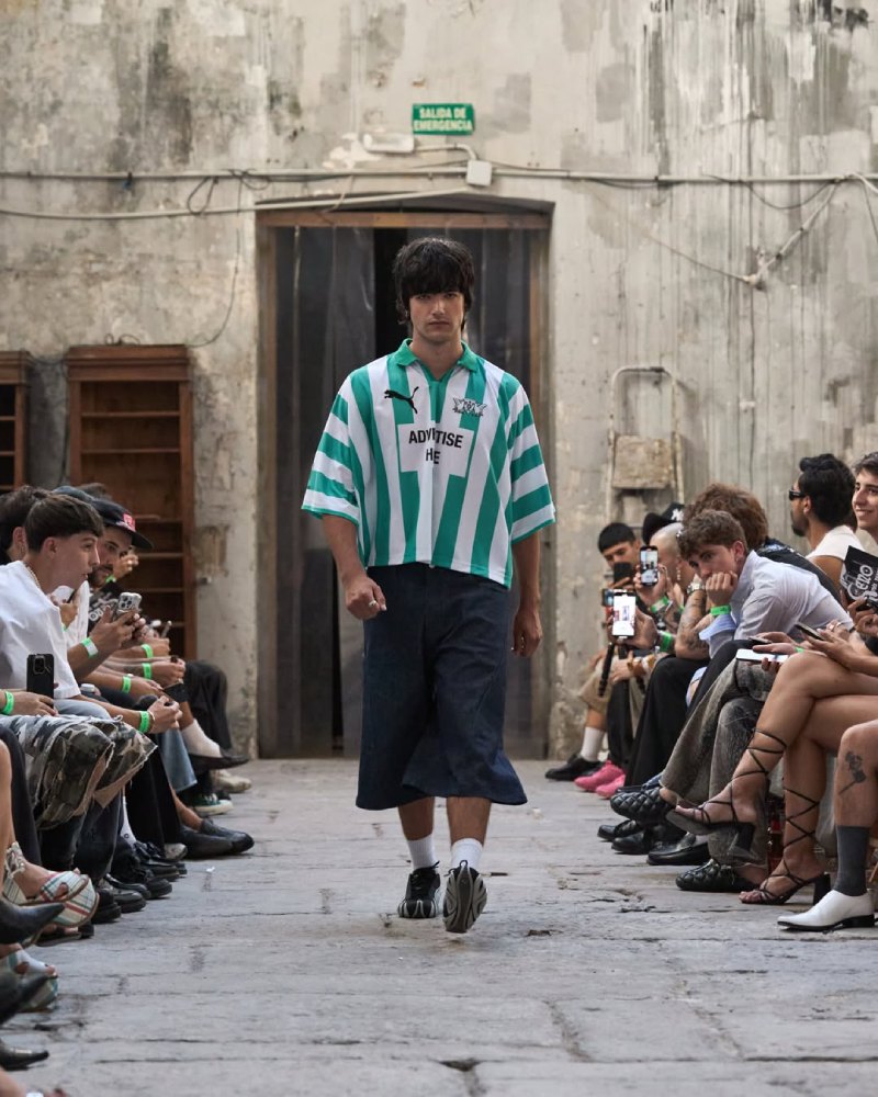 El highlight con el que la firma se ha hecho con la atención del mundillo internacional es la cápsula colaborativa de Dame Après Paris X Puma, una mezcla de lo que hemos visto durante años con el lenguaje subversivo característico de la firma. La cápsula abre con una camiseta futbolera, típicamente Dame. Sin embargo, esta presenta un nuevo print a rayas verdes y blancas (una de las primeras combinaciones de color de la firma) acentuada con un Jumping Cat y un marco de “Advertise Here”. Seguidamente, vemos pantalones de chándal técnico exageradamente baggy cuyos detalles beben de la silueta del icónico Formstrip.