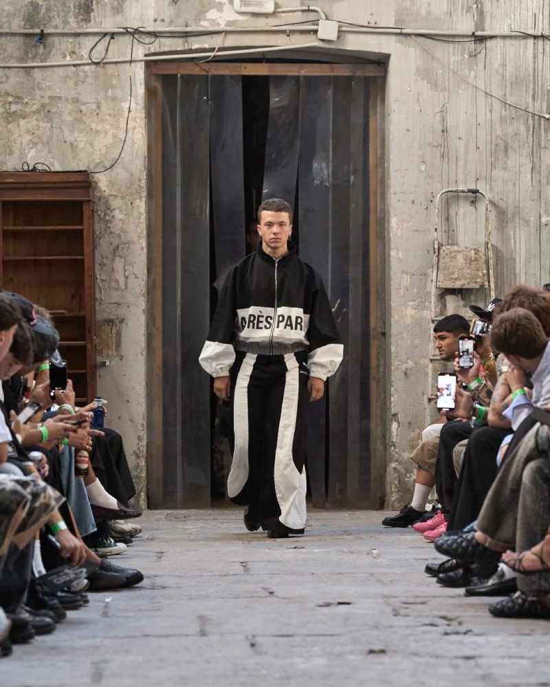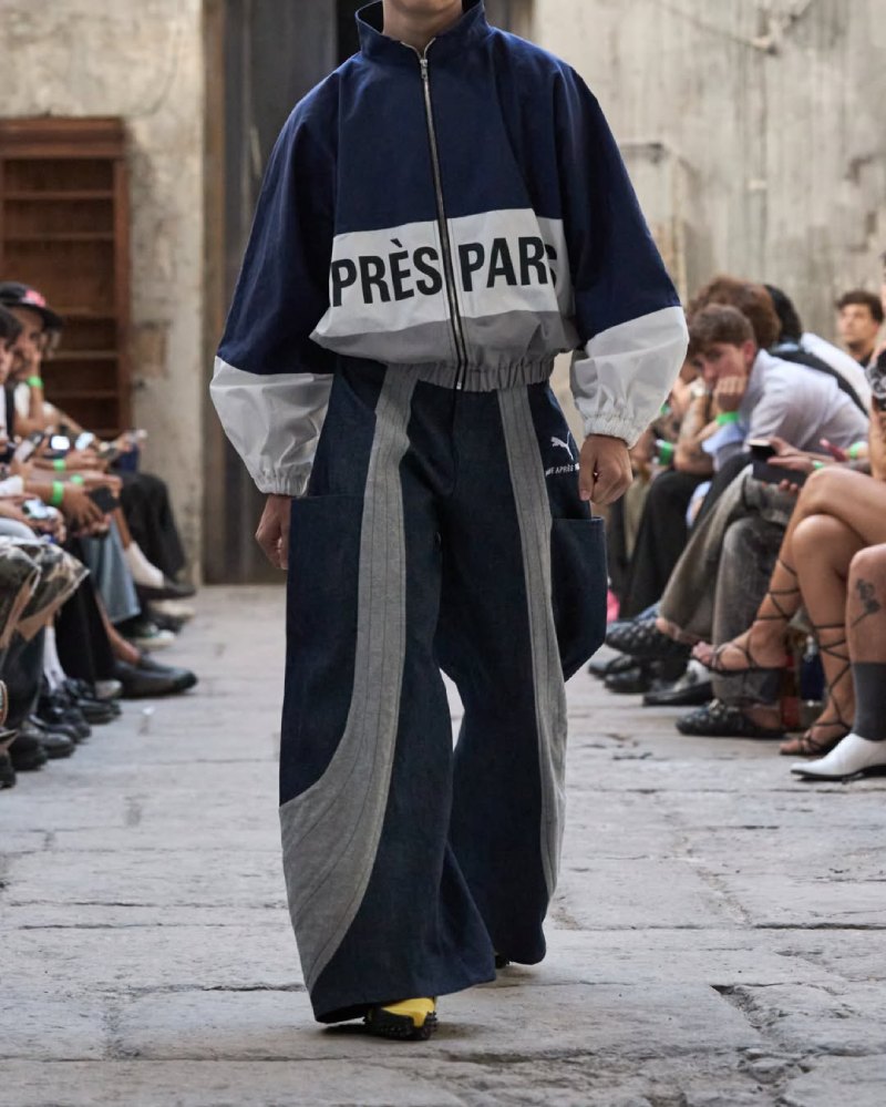 Pero, de igual manera, el nuevo armario de Dame Après Paris que ha hecho Dacal se siente también como terreno familiar. Aquí, las siluetas con las que esta firma se ha ganado un seguimiento de culto en el underground siguen permaneciendo como el elemento central: cortes exagerados y arquitectónicos, hombros caídos, bajos cropped, pantalones que se amontonan; outerwear que engulle. Y bueno, también está la cápsula Dame Après Paris X Puma, que sirve como señal de evolución.