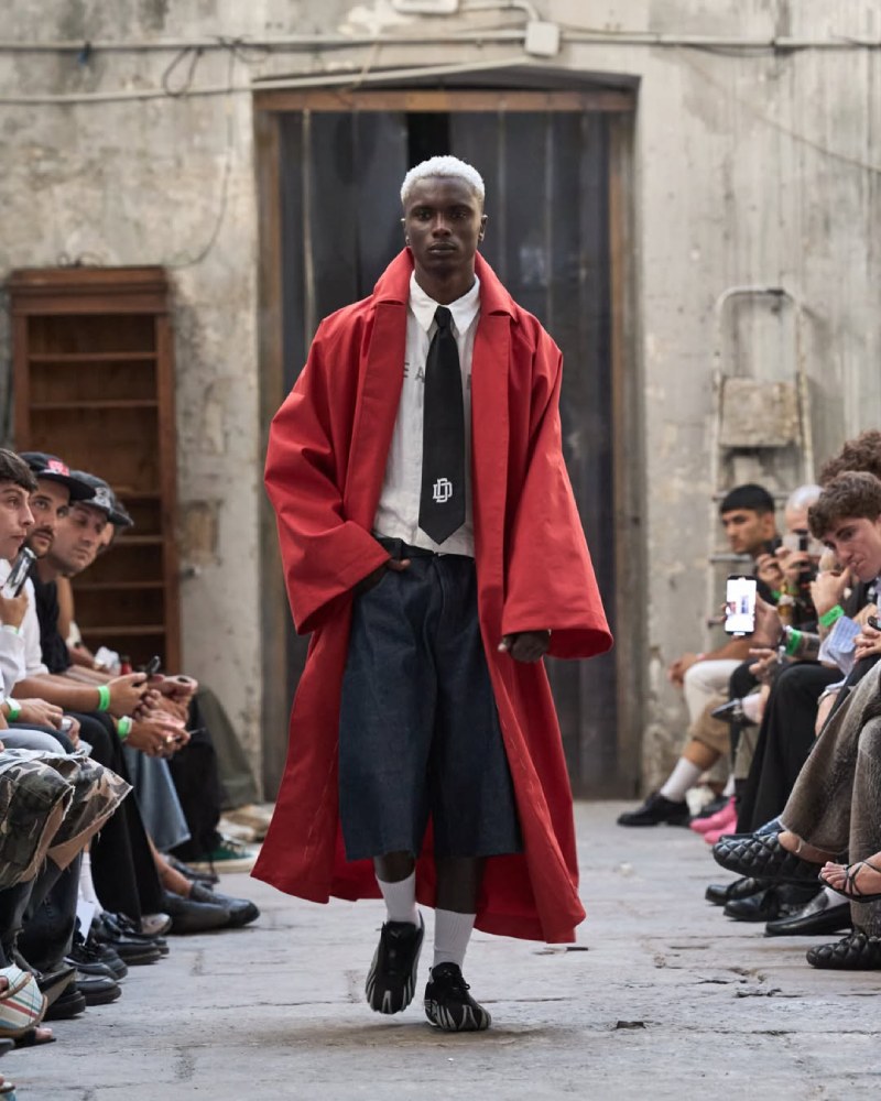 Dame Après Paris vuelve también a una de sus mejores creaciones: el traje cropped cruzado. La versión de Geno se presenta estampada en raya diplomática gris y se subvierte con un pantalón de pinzas compuesto de paneles mucho más complejos que sugieren también un aire de cargo (sin llegar a serlo). En esa misma línea, vemos otro acercamiento al menswear clásico con una gabardina oversize en rojo, que esconde una camisa de botones más de vestir y una corbata monogrameada. Y, cerrando el look con un toque más de avant-garde, vemos una bomber despojada de cuello con capucha que añade misticismo a lo típicamente streetwear. Y con esto confirmamos lo que dijimos en su momento: Dame está en la punta de lanza aquí en España.