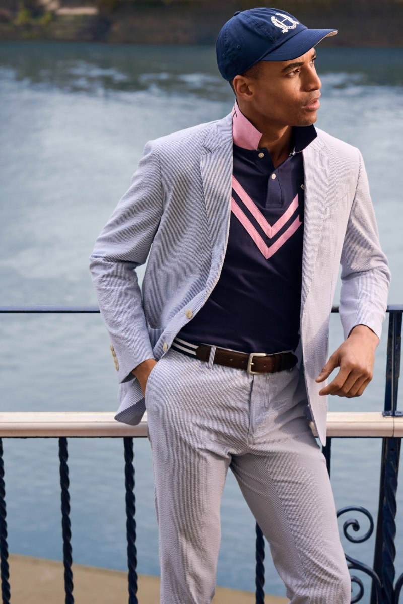 Este repertorio de looks de estilo varsity clásico abre con sus combinaciones más clásicas. Bebiendo de la sastrería de Saville Row, tenemos conjuntos de americanas casuales y pantalones descoordinados. Debajo, salen a relucir composiciones de capas muy interesantes, donde vemos chalecos de punto, camisas abiertas y camisetas a rayas; pero también tenemos settings más elegantes y formales. El polo de rugby es otro de los highlights de la colección, y rescata el look icónico de rayas de colores con cuellos blancos a contraste.