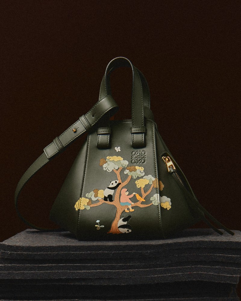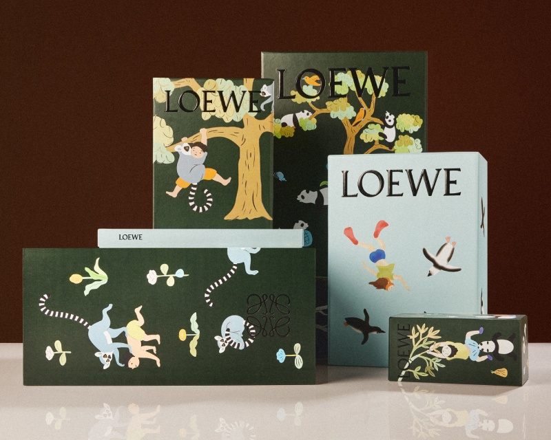Los regalos de Navidad de Loewe, tan especiales como únicos, se decoran con gráficos inspirados en la imaginación, los recuerdos, las mascotas y la vida con su hijo. Estos motivos se trasladan a algunas de las siluetas de bolsos más característicos de Loewe. Por ejemplo, un Hammock verde intenso sirve como telón para un niño sentado en un árbol que da de comer a un pájaro amarillo. Otras escenas de la misma imaginación cobran vida en demás siluetas de bolsos de coleccionista.