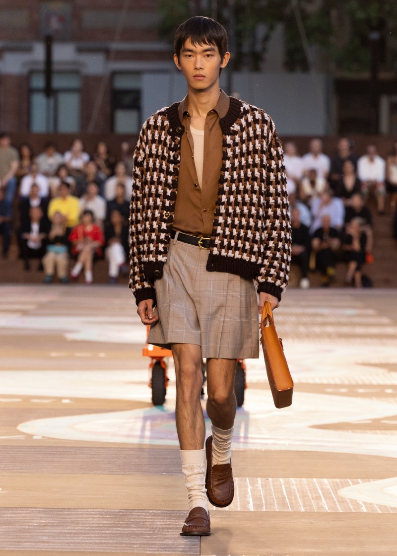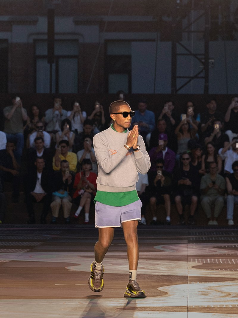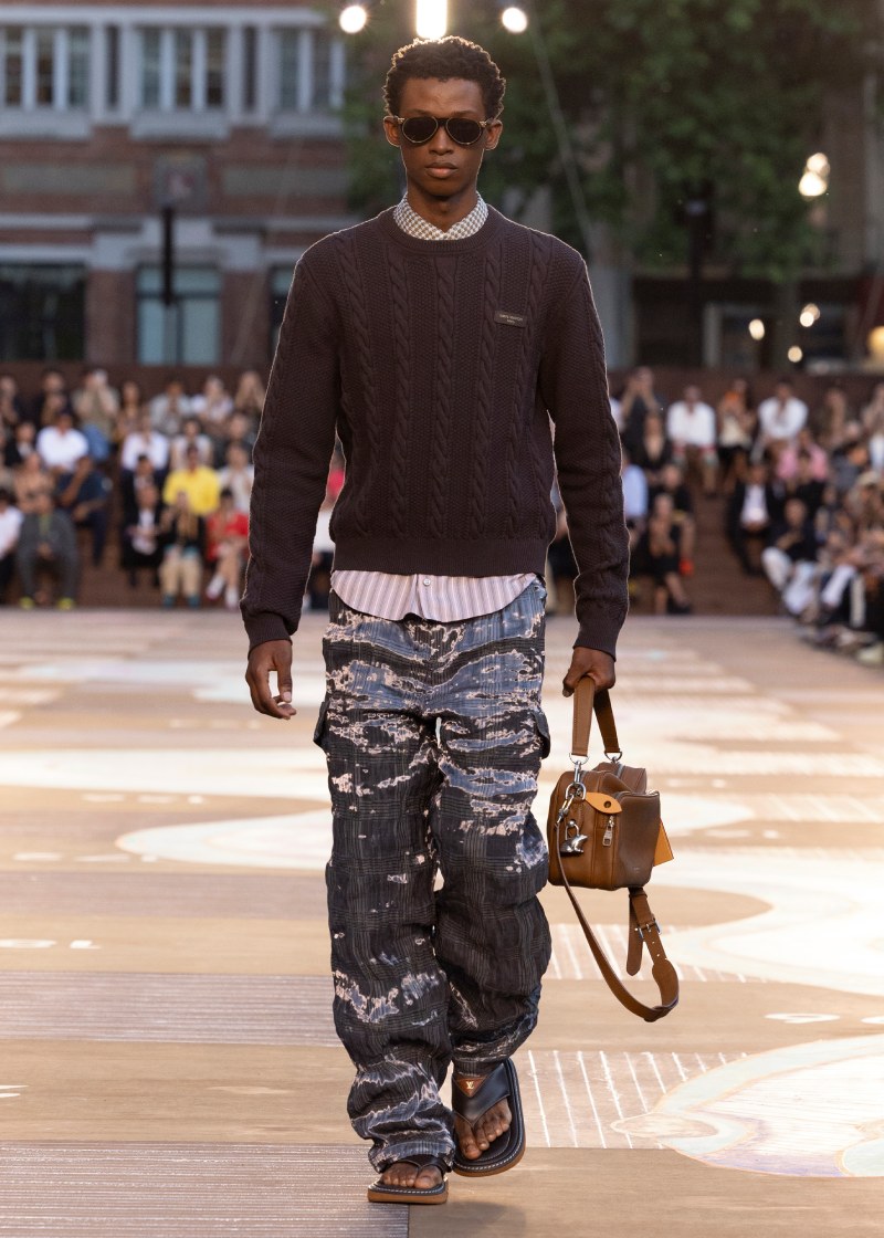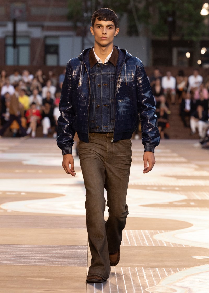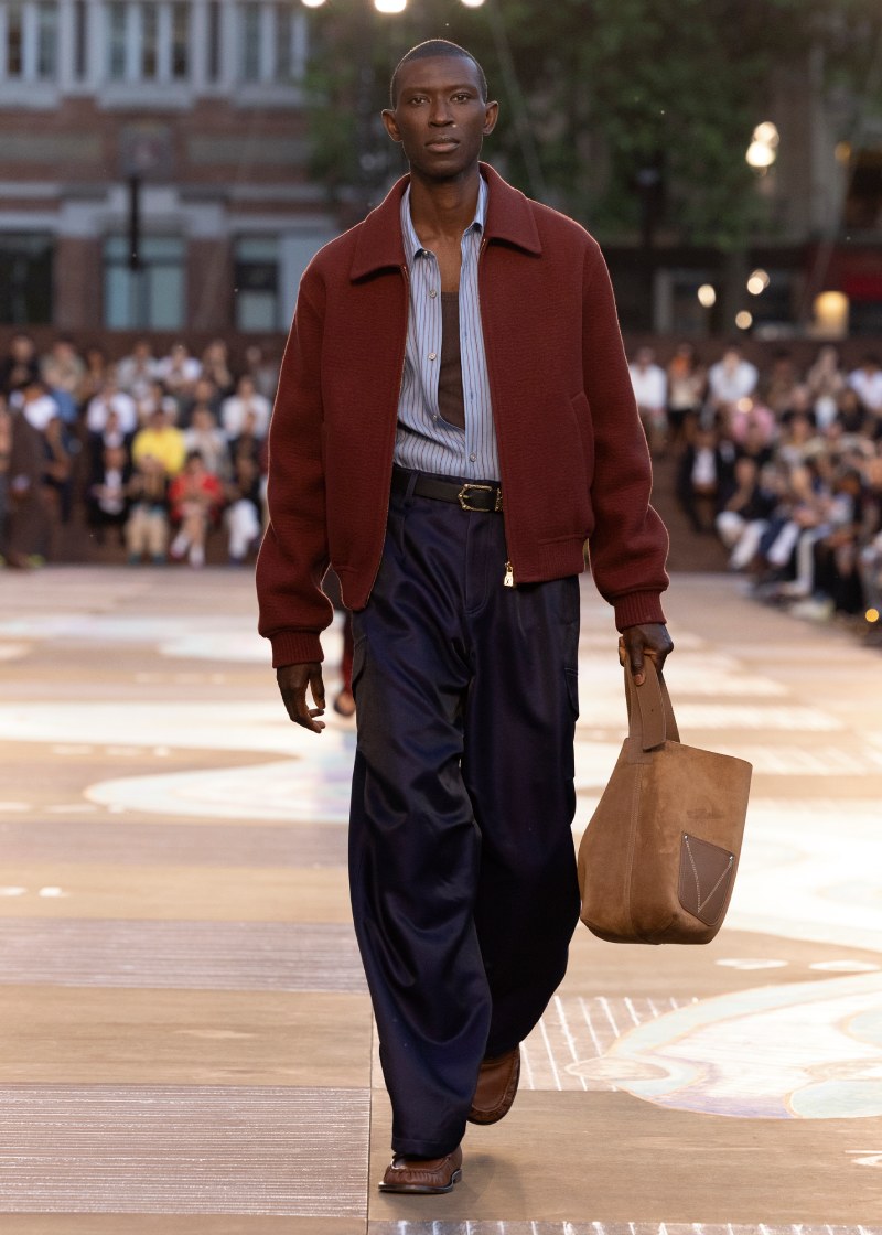 El theme de la sastrería es tan ubicuo que hasta el lado más casual y street de la colección se siente salido de lo tailoring. Los jerséis de punto se presentan con patrones y tramas mucho más complejas, mezclando chic parisino y flare indio; el pantalón de pinzas destaca como bermuda ultra corta; los chalecos y los polos se tejen con patrones tradicionales; el denim se tiñe de marrón en vez de azul (o se estampa con cuadros Príncipe de Gales). Todo apunta a lo neomenswear como apuesta por la sofisticación. Pero, como pieza statement, hay que mirar a la bomber de piel de cocodrilo azul medianoche para entender ese flare que tanto sabe hacer Pharrell.