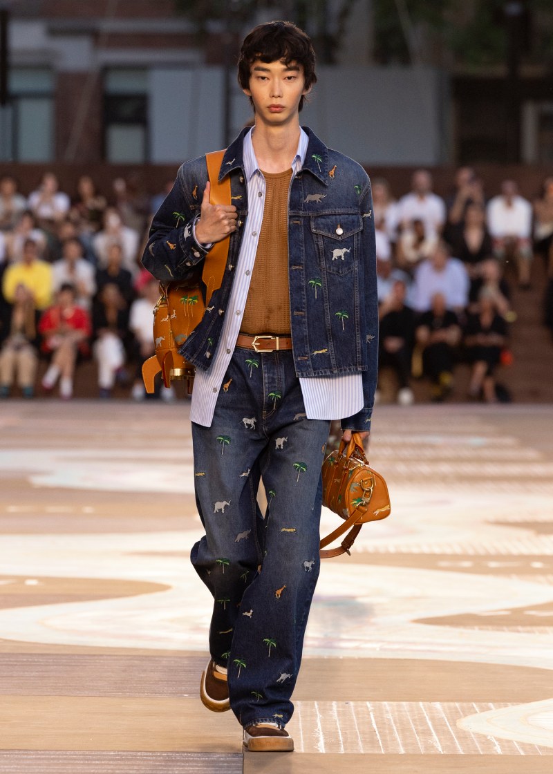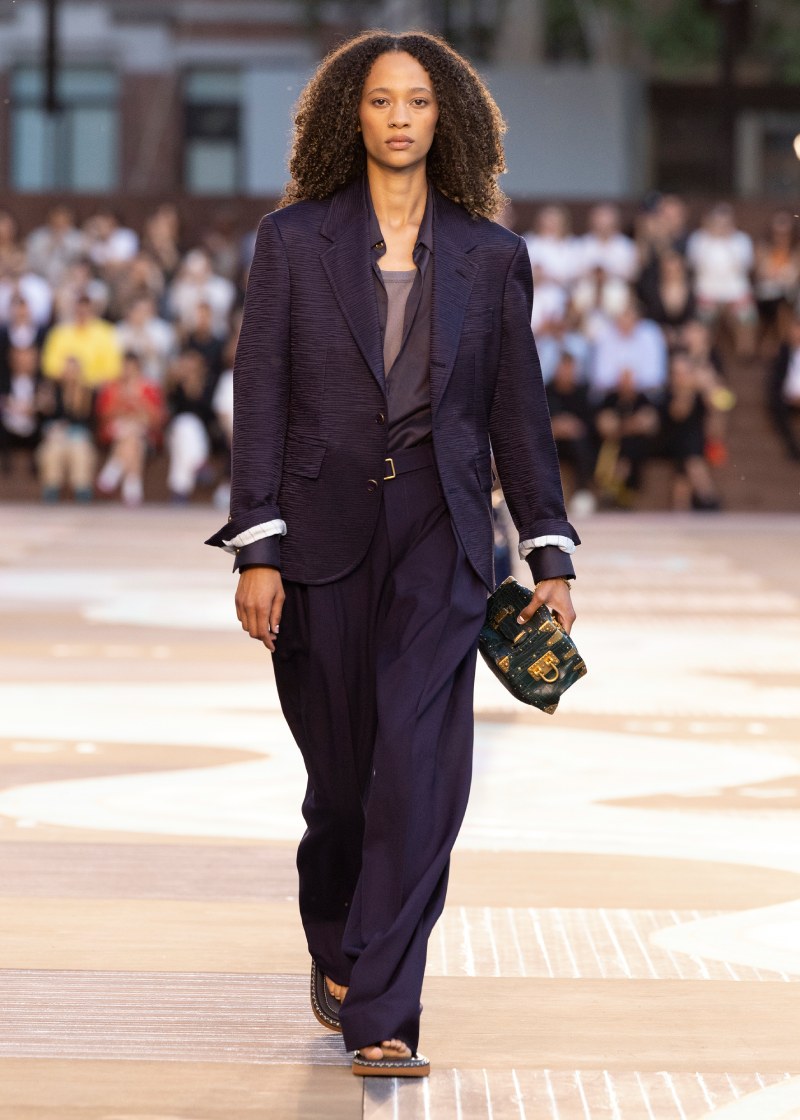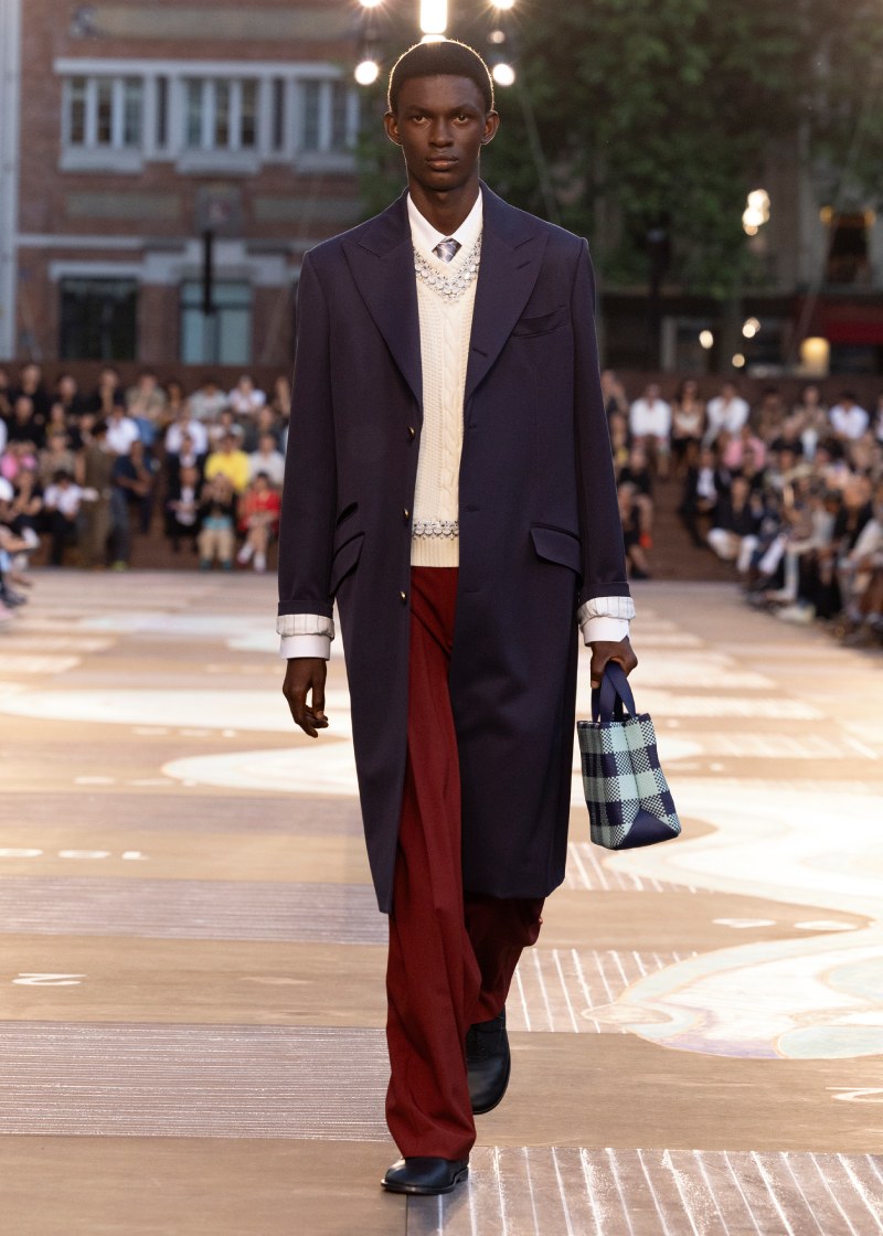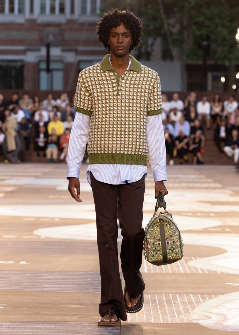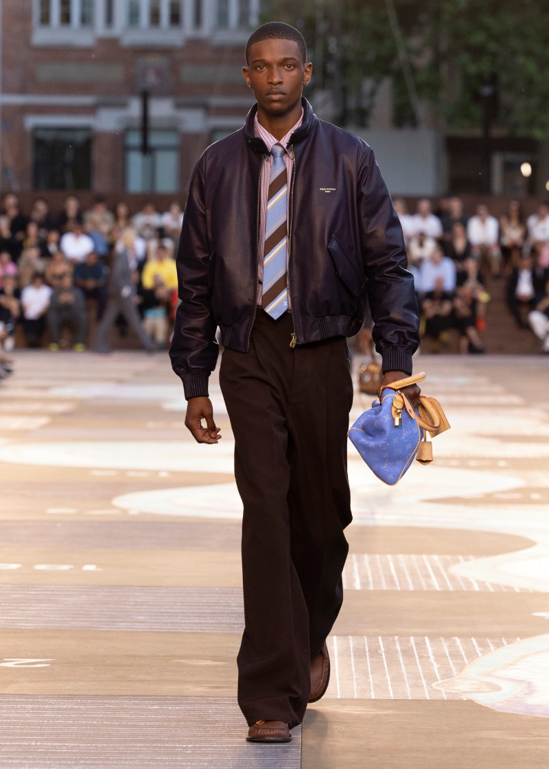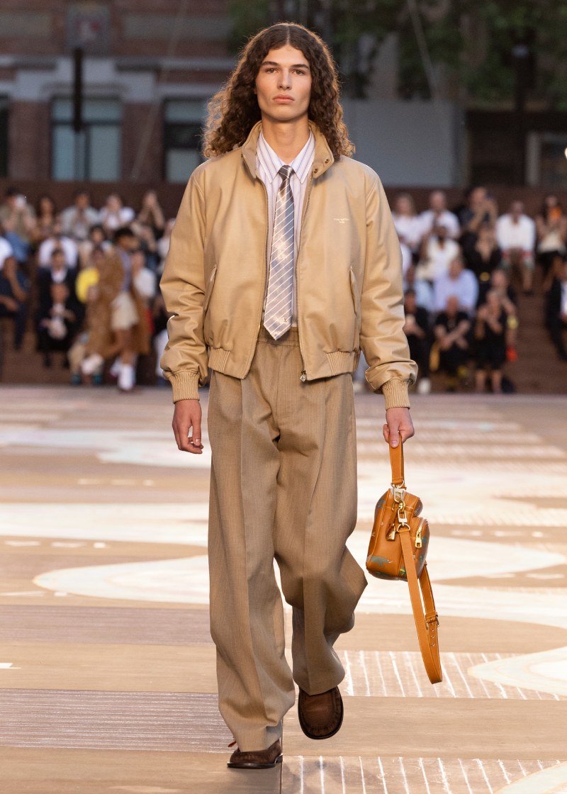 El theme de la sastrería es tan ubicuo que hasta el lado más casual y street de la colección se siente salido de lo tailoring. Los jerséis de punto se presentan con patrones y tramas mucho más complejas, mezclando chic parisino y flare indio; el pantalón de pinzas destaca como bermuda ultra corta; los chalecos y los polos se tejen con patrones tradicionales; el denim se tiñe de marrón en vez de azul (o se estampa con cuadros Príncipe de Gales). Todo apunta a lo neomenswear como apuesta por la sofisticación. Pero, como pieza statement, hay que mirar a la bomber de piel de cocodrilo azul medianoche para entender ese flare que tanto sabe hacer Pharrell.