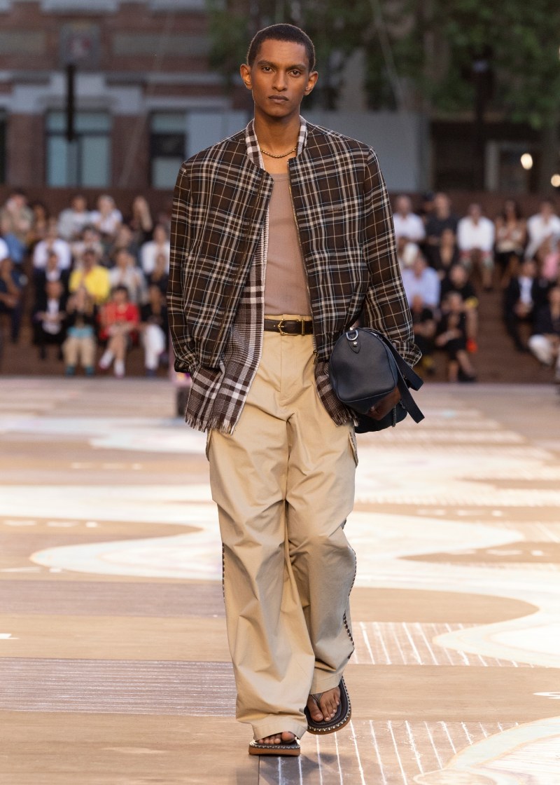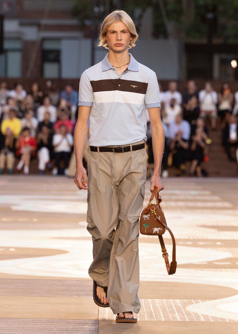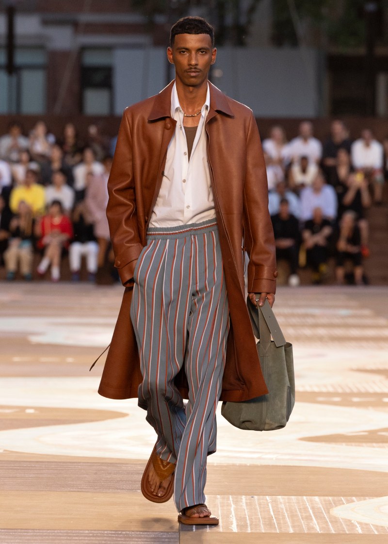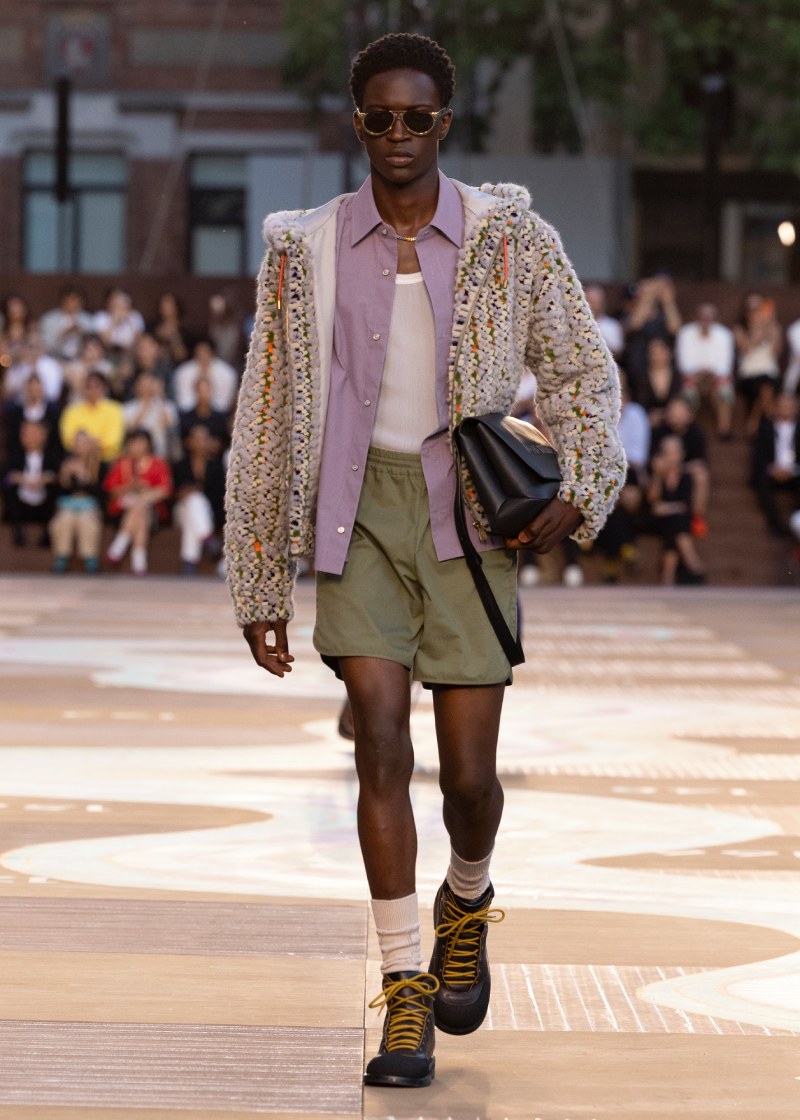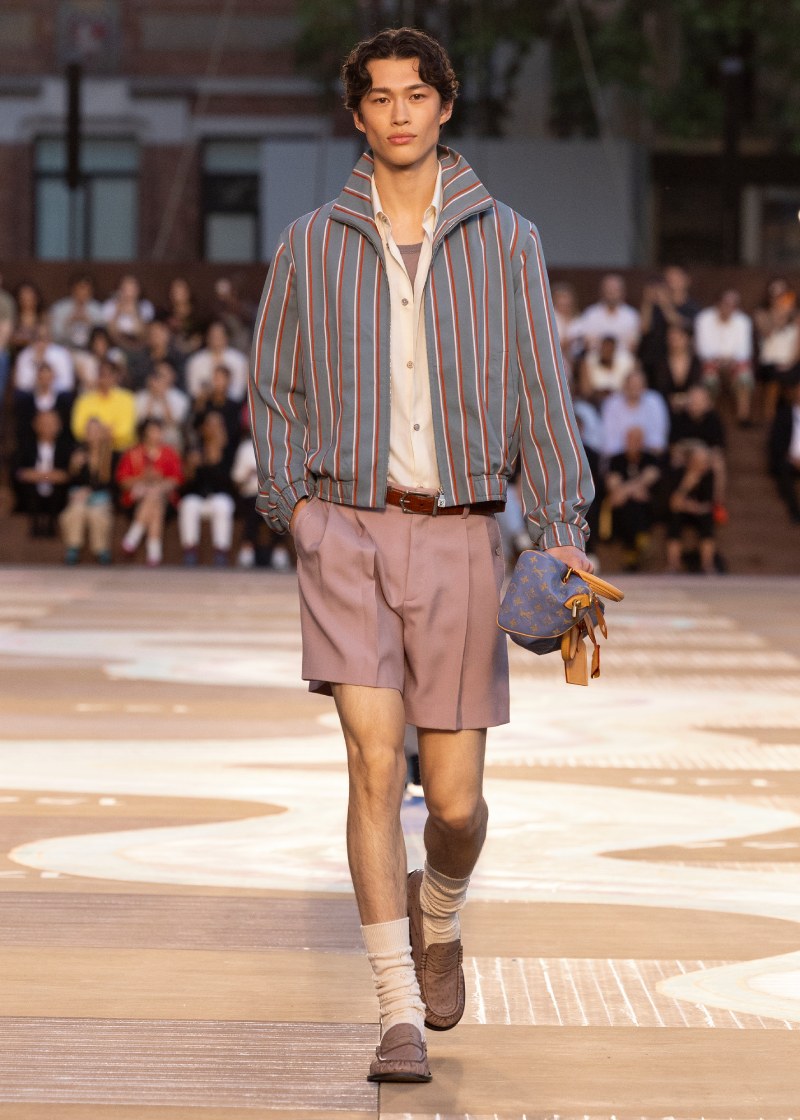 El theme de la sastrería es tan ubicuo que hasta el lado más casual y street de la colección se siente salido de lo tailoring. Los jerséis de punto se presentan con patrones y tramas mucho más complejas, mezclando chic parisino y flare indio; el pantalón de pinzas destaca como bermuda ultra corta; los chalecos y los polos se tejen con patrones tradicionales; el denim se tiñe de marrón en vez de azul (o se estampa con cuadros Príncipe de Gales). Todo apunta a lo neomenswear como apuesta por la sofisticación. Pero, como pieza statement, hay que mirar a la bomber de piel de cocodrilo azul medianoche para entender ese flare que tanto sabe hacer Pharrell.