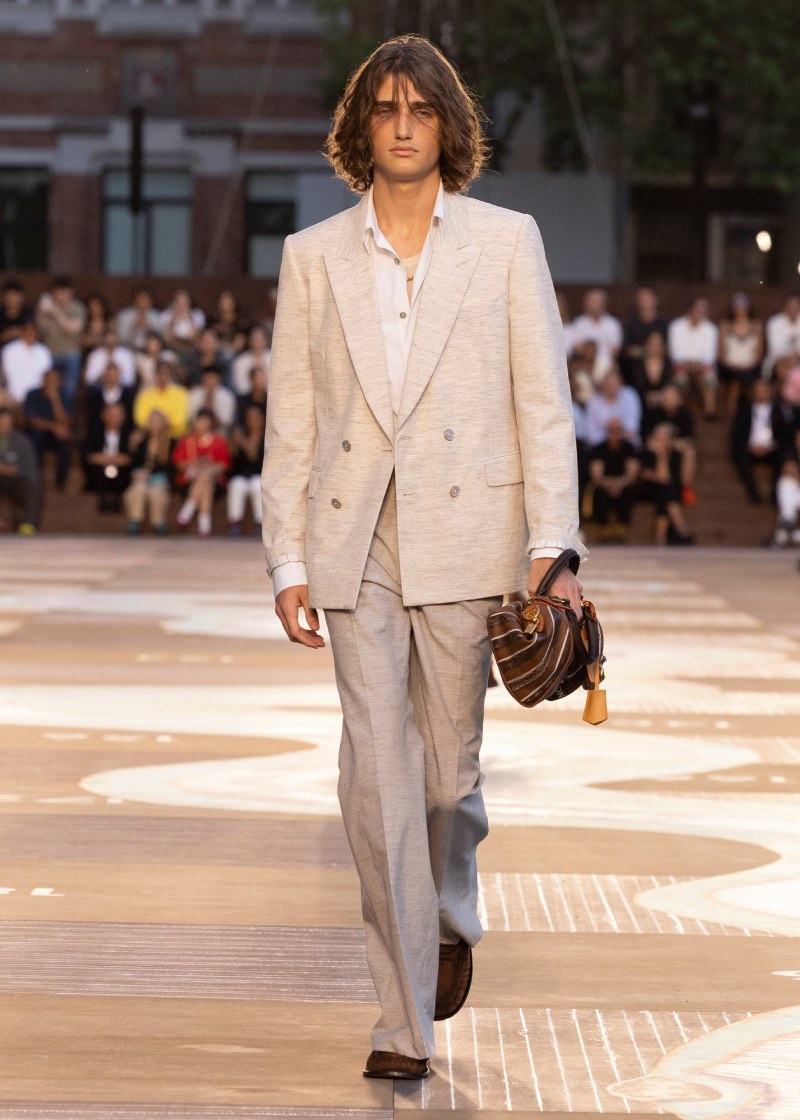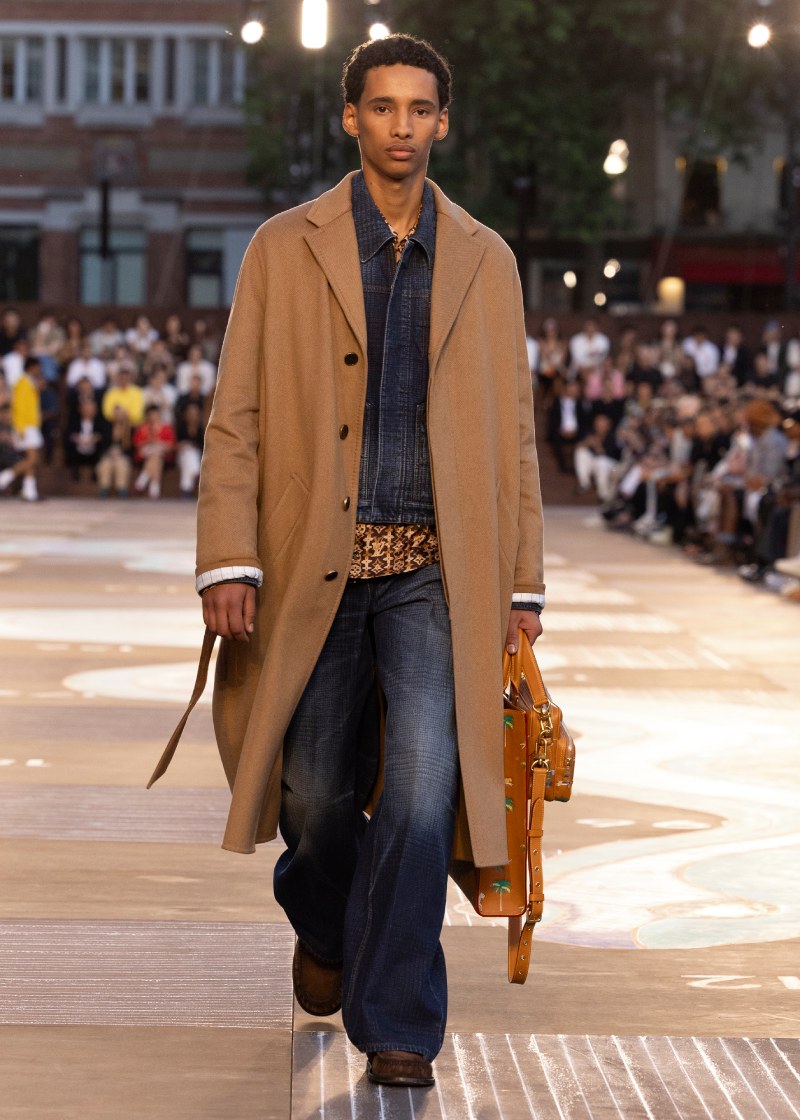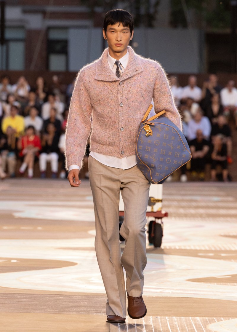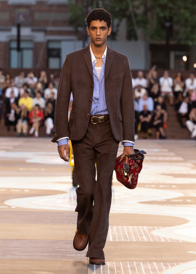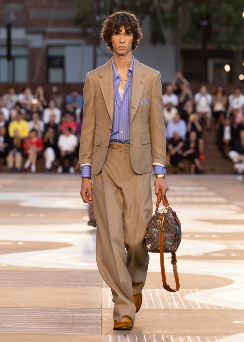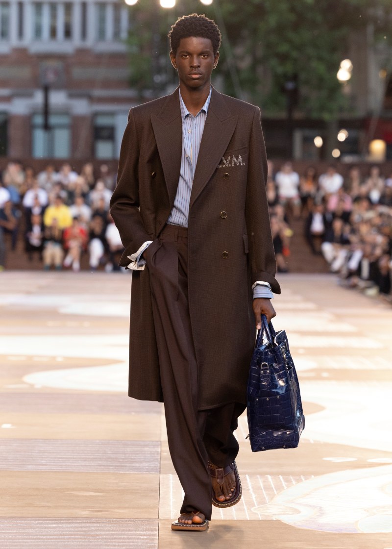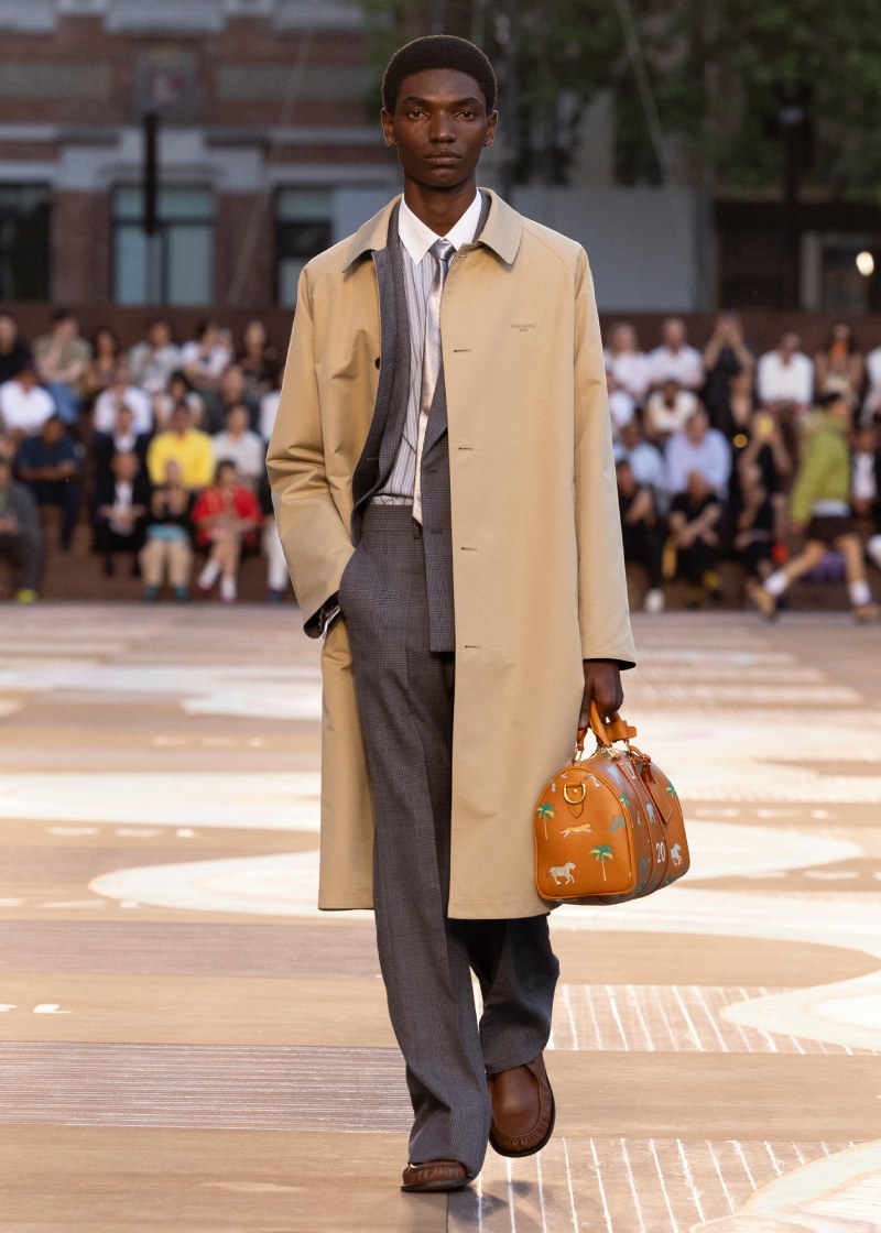 La nueva colección de Louis Vuitton Mens ss26 es dandy, sí; pero también salen a relucir nuevas facetas de lo que se entiende como tal. Y claro, al mirar a este tipo de armario, el focus de menswear, cosa que siempre vemos como co-protagonista, se aumenta en gran medida. Sí; hay un poco de streetwear y menswear como siempre… pero pasan a un segundo plano cuando vemos el -espectáculo- que son los conjuntos de traje. Y los accesorios tampoco se quedan atrás, especialmente si mencionamos que, por primera vez, la maison incluirá en su colección las maletas que hizo como custom para la película The Darjeeling Limited de Wes Anderson.