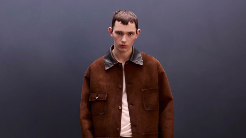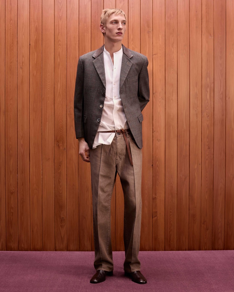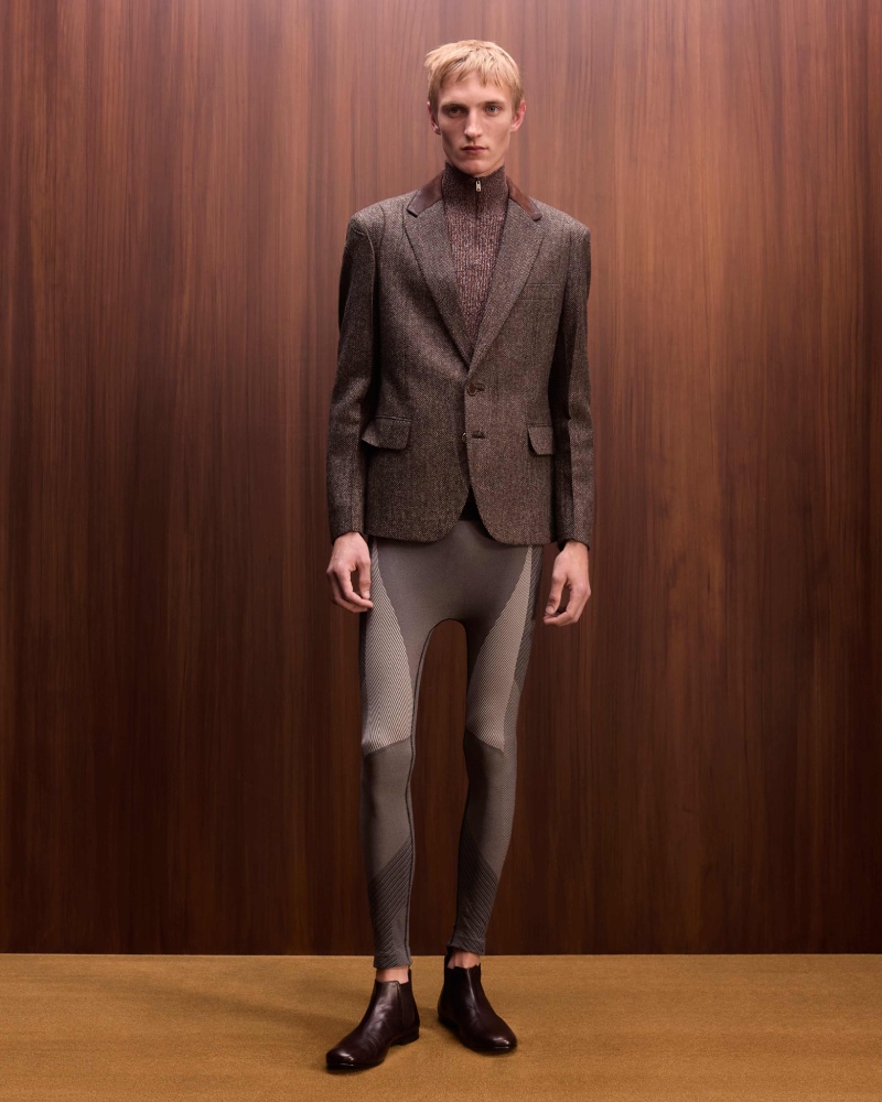 Prada Winter 2025 Hombre sigue con su workwear recontextualizado con una cazadora de ante utilitaria y cuello de piel a contraste. Aquí, las prendas de punto, los vaqueros más holgados las parkas y cortavientos se encargan de añadir aún más función a la forma; adelantando los grandes “sacrilegios” de la colección. ¿Cuáles son? Tops de performance sobre pantalones de traje; abrigos de ¾ sobre leggings forrados; camisas de aire western con bermudas cargo y americanas con leggings (sí, habéis leído bien).