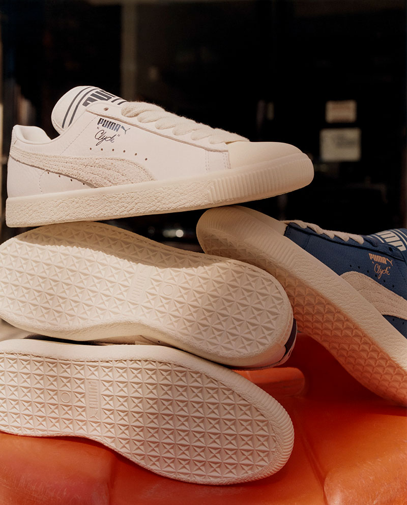 También hay algo para amantes de lo monocromático en este nuevo drop de Puma X Rhuigi Villaseñor. El segundo colorway de estas Clyde de barbería se presenta en la misma piel granulada, pero ahora completamente blancas. Pequeños acentos en azul unen estas zapatillas con la idea central de la colección.