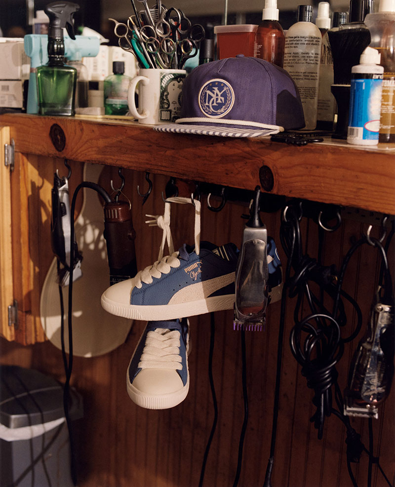 Como es habitual, esta colección de barber shop firmada por Puma X Rhuigi Villaseñor abre con nuevas versiones de sus siluetas míticas. El Drop Five de estos dos nombres ofrece dos nuevas versiones de la siempre icónica zapatilla Puma Clyde. El primer colorway muestra una construcción bicolor en cuero granulado que se ve tan suave como la seda. Estas zapatillas azules se acentúan con una suela, puntera y cordones gruesos en blanco vintage. Para balancear tanto cuero, una Formstrip de ante a juego con los demás acentos cierra el look.