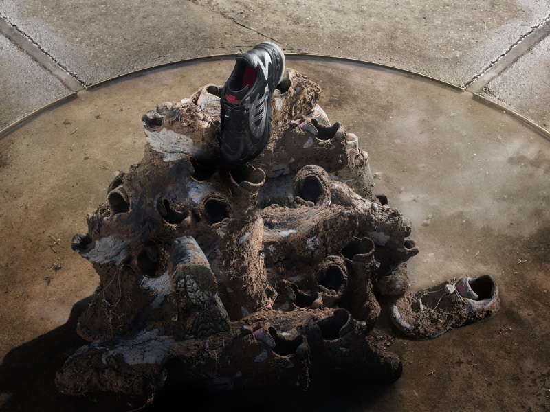 Seguidamente, tenemos la silueta Savage, que recontextualiza la típica silueta deportiva que adidas estaba creando en los 2000 con las Savage. Esta nueva zapatilla combina una base de mesh con paneles engomados de líneas onduladas; pero no son lisos. Estos apliques se decoran con un print topográfico que resuena con los mapas de estos juegos, sumándole puntos también de gorpcore, a juego con el sistema de cordones hiking. Y, para looks más tirados, tenemos también un modelo de sandalias Adilette.