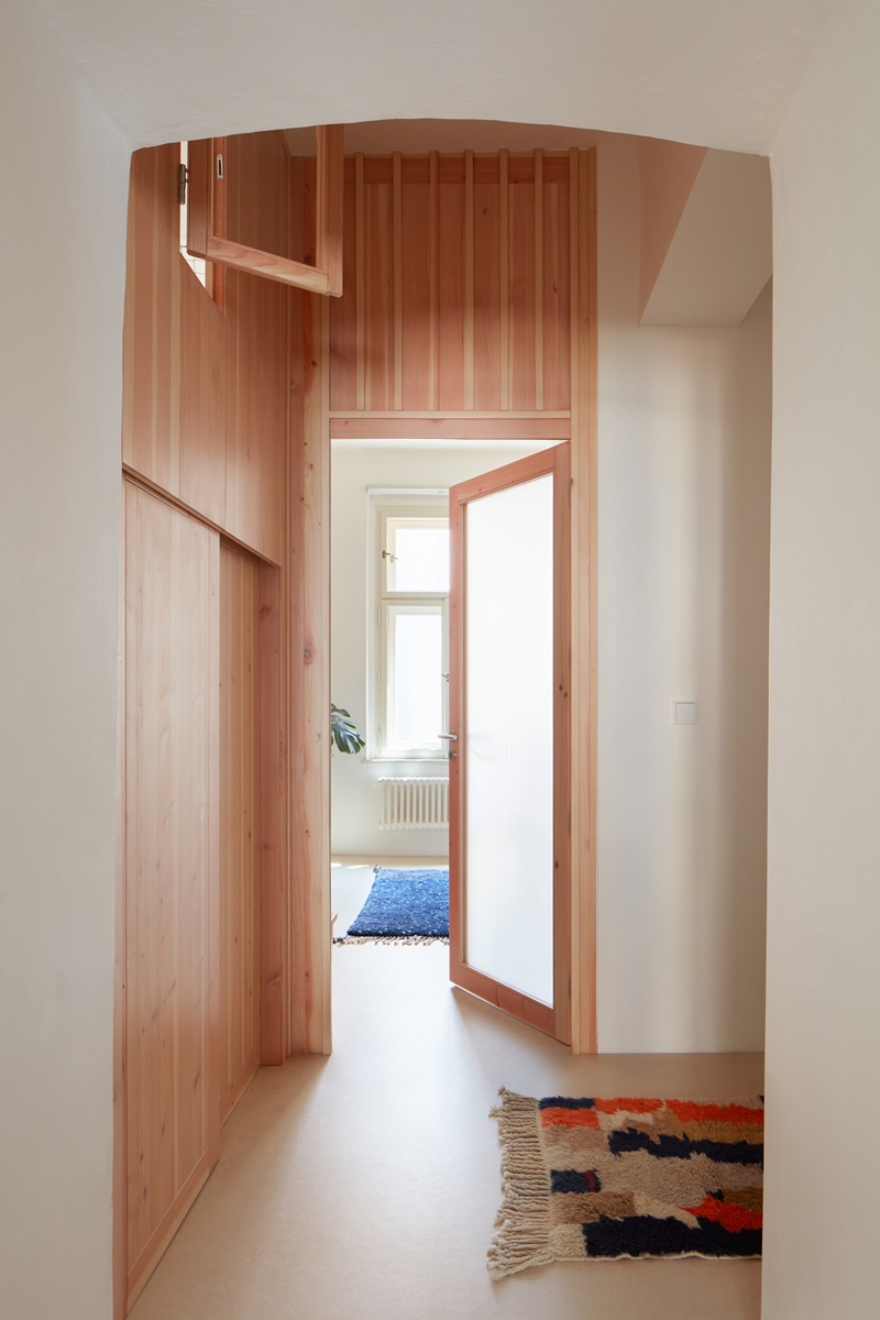 El emergente distrito de Vršovice, en la periferia sureste de Praga, es conocido por sus nuevas concept stores y restaurantes de cocina creativa, instalados en los monumentales edificios modernistas de principios del siglo XX que singularizan la retorcida trama urbana de la zona vieja. Un área tranquila, desde la que se puede ir dando un paseo a los románticos jardines Havlíček, y recorrer este parque de inspiración renacentista italiana por una boscosa ladera con viñedos y bellas vistas de la ciudad. Este es el contexto que define los alrededores del apartamento reformado por las fundadoras de Plus One Architects, con estudio propio en Praga desde 2019.