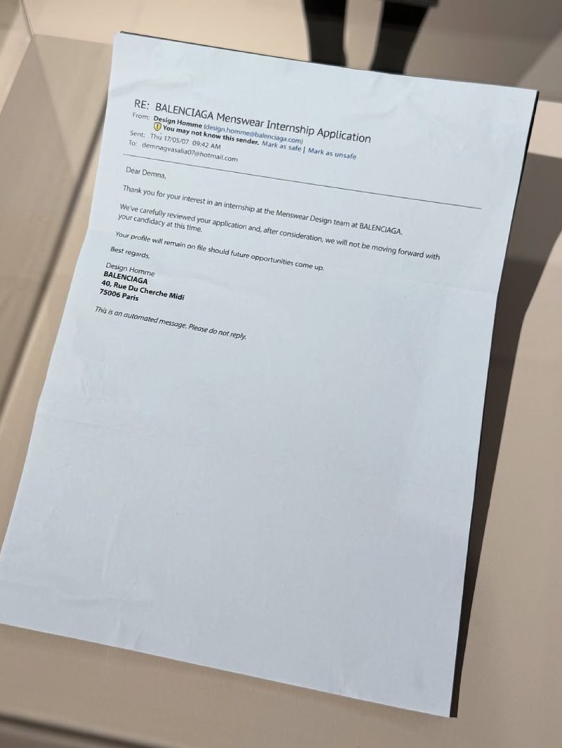 La exposición Balenciaga by Demna recoge looks completos de pasarelas anteriores, prendas seleccionadas y accesorios. Todas y cada una de las piezas que se muestran han sido seleccionadas personalmente por él mismo, ojo. Y, además de esto, podemos ver objetos más raros, como las invitaciones a algunos de sus desfiles, esculturas híper realistas de sus modelos preferidos con looks de sus colecciones. Y, como pieza estelar, una escultura de Demna con el look que llevó para la Met Gala (cuando fue con Kim Kardashian). Y así como curiosidad, también se expone el mail en el que Balenciaga le rechazó para hacer unas prácticas en 2007.