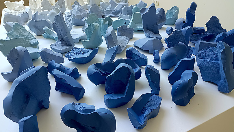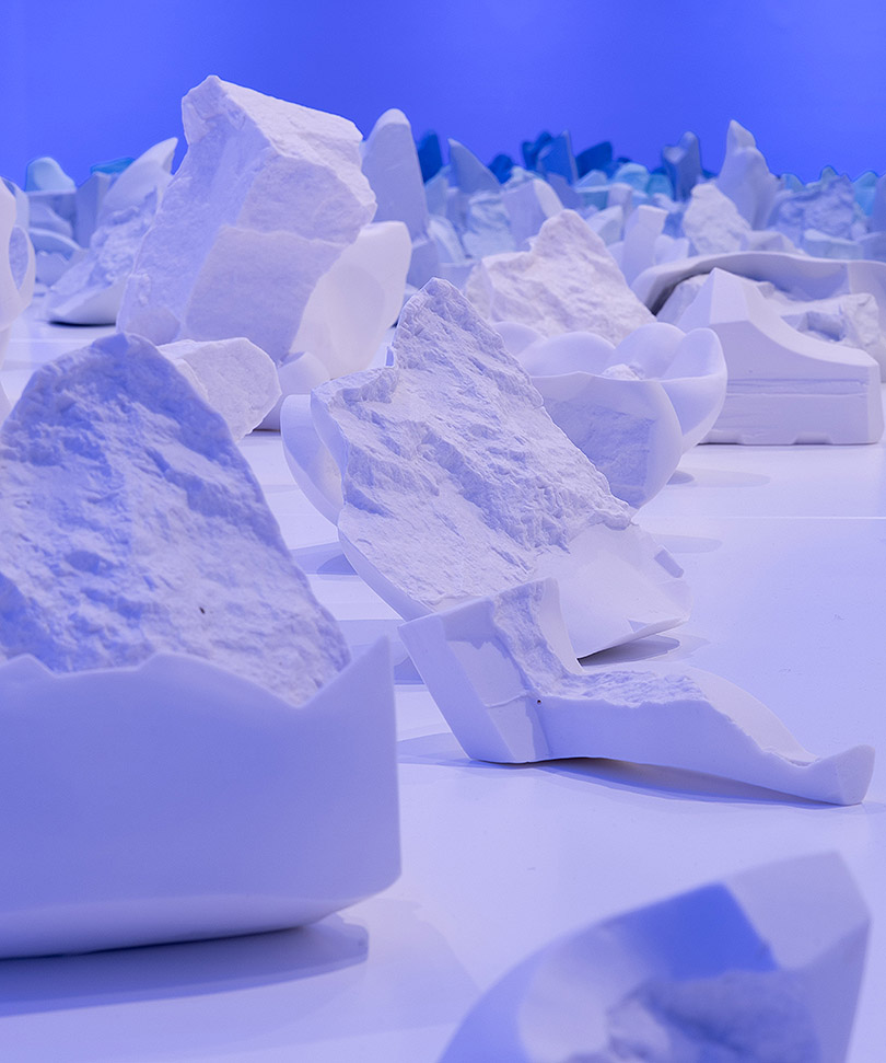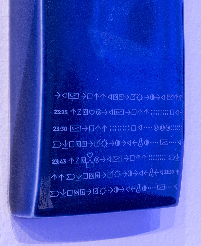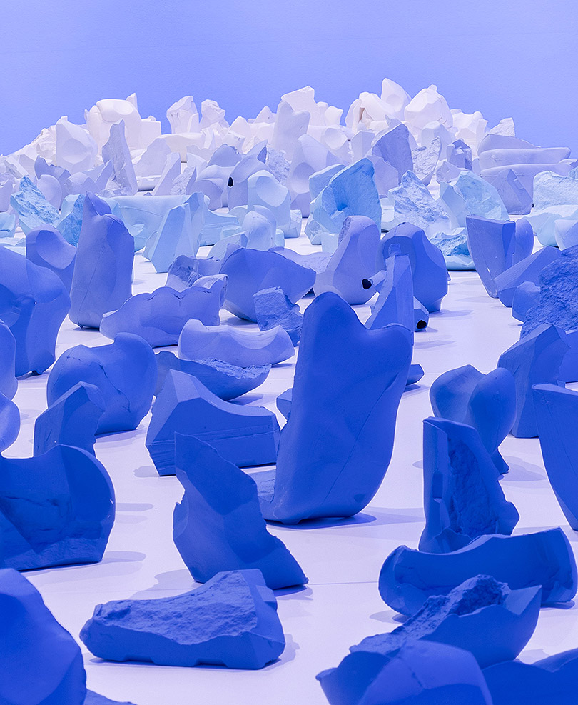 El azul cobalto es un pigmento cargado de historia y simbolismo. En “Landscapes of Affection”, actúa como un hilo conductor que visibiliza las complejidades de la explotación mineral en la cultura digital. Su degradado en la instalación de esculturas de porcelana, “Technoceramics”, refleja los rastros de la extracción y los residuos invisibles que deja la tecnología. Emocionalmente, también conecta con lo valioso y lo oculto. Refleja tanto los recursos minerales, que se extraen sin ser vistos, como los datos digitales que se explotan sin que seamos conscientes de ello.