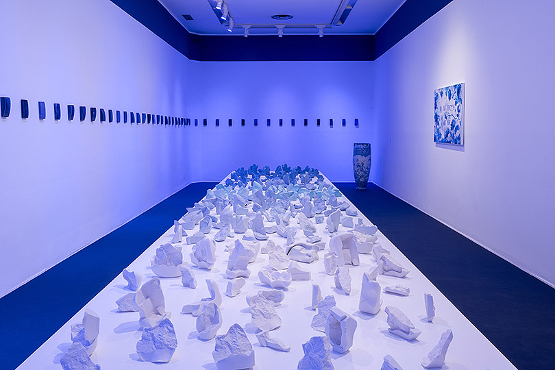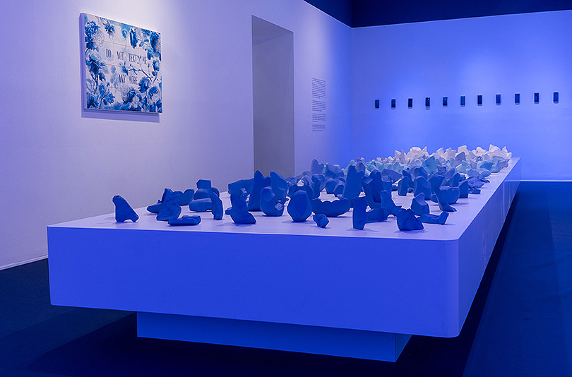 El diálogo entre las obras de la colección del Museo y la instalación se realiza a través de una lectura del uso del Cobalto a lo largo de la historia del arte. Este siempre ha estado muy vinculado al desarrollo de la decoración dentro de la industria de la cerámica y el vidrio. El uso de piezas de la Real Fábrica de Sargadelos junto a obras contemporáneas refleja cómo los mismos materiales pueden resonar en diferentes contextos. Esta combinación establece un puente entre la extracción mineral histórica y su explotación actual en la cultura digital.