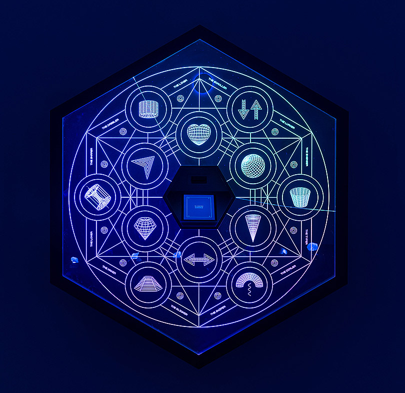 “Dat – Astral Chart” es una máquina de predicciones que escanea las huellas dactilares y el teléfono móvil de los visitantes, generando una lectura especulativa de personalidad digital y su evolución futura. Los participantes reciben una tarjeta con su tipo de personalidad, que está vinculada a un conjunto de serigrafías que presentan estas identidades digitales en un imaginario arcano, en dorado y azul cobalto. Esta obra conecta lo tecnológico con lo esotérico, jugando con la idea de la minería de datos y la futurología.