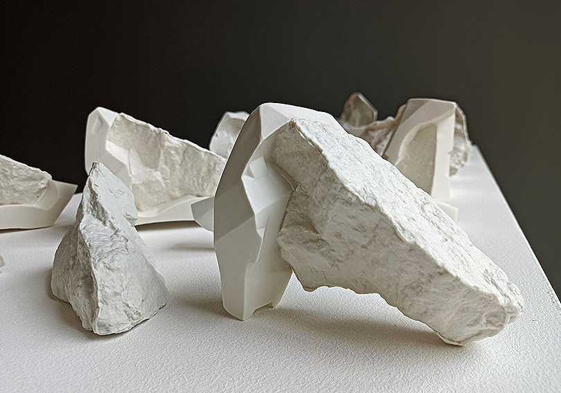 El desarrollo de esta exposición implicó un largo proceso de investigación que comenzó en las minas de cobalto de Blaafarveværket en Noruega. Allí, me centré en las huellas dejadas por la extracción a gran escala, recogiendo restos minerales que luego transformé en esculturas de porcelana. Estas piezas reflejan la huella física de la minería y su relación con los residuos digitales, conectando el espacio negativo de los restos minerales con el vacío dejado por la tecnología que consumimos sin pensar en sus orígenes.