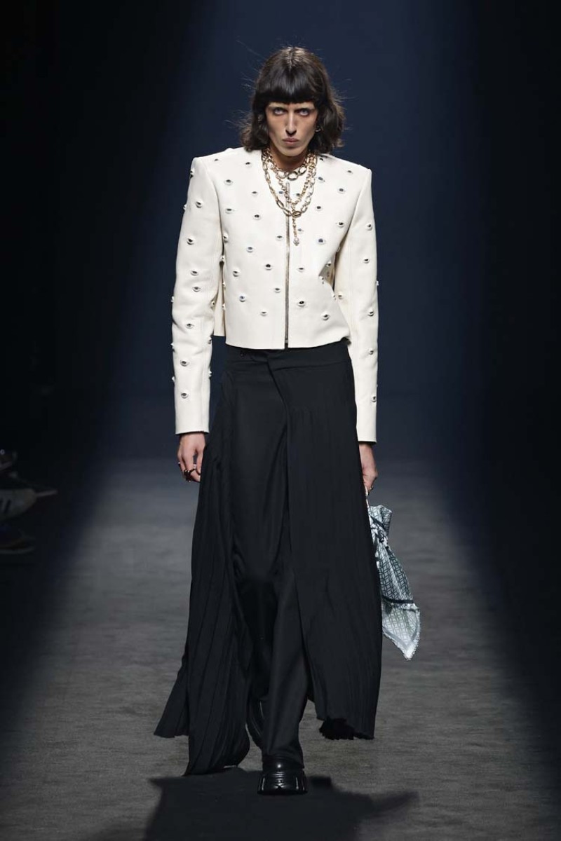 ¿Y de qué trata la colección de Álvaro Calafat? Como te hemos dicho arriba, el diseñador fue a París y conoce un gabinete que tenía todo tipo de curiosidades que empezaron a almacenarse desde 1789. Entre tanto objetivo, Calafat encuentra una inspiración y se hace fuerte para demostrar que hay hueco de la nueva moda en MBFW Madrid. Este objetivo lo consigue a través de versiones de la mítica chaqueta de tweed de Chanel, de la incorporación de la artesanía como son las manos negras o la liga en la media sin ese toque sexualizado hacia la mujer. Como la falda en forma de platillo que es pura cerámica y artesanal.