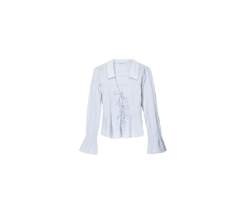 De toda la nueva ropa de Bershka, además de quedarte con los diseños anchos y urbanos, también hay espacio para algo más delicado y femenino. Un buen ejemplo es esta camisa rústica estilo francés en azul claro. Es la típica blusa sencilla que, con su tejido y esos lazos en la zona delantera para ajustar, añade un toque muy chic a cualquier look que te hagas.