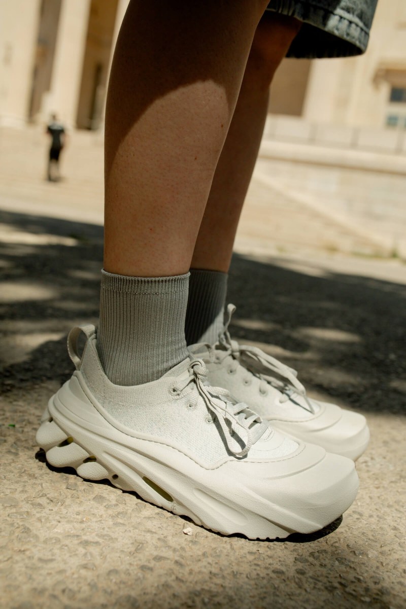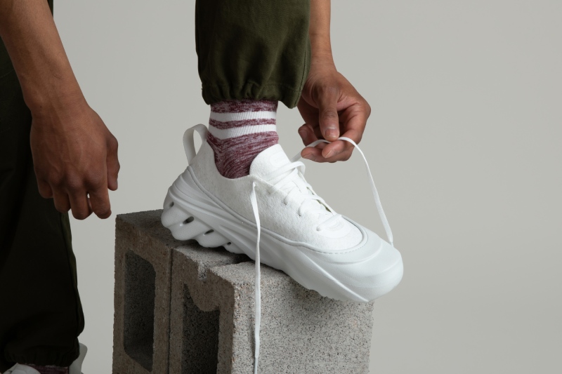 Pero el gran atractivo de las Crocs Echo Surge está en su parte inferior. Todo el lower de la silueta se compone del compuesto propietary de Crocs y presenta volúmenes esculpidos y exagerados bastante interesantes. El talón viene con construcción abierta y transiciona a lo que puede ser una suela de runner; y todo termina con una puntera cuadrada y chunky espectacular.