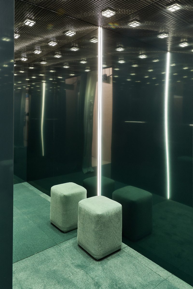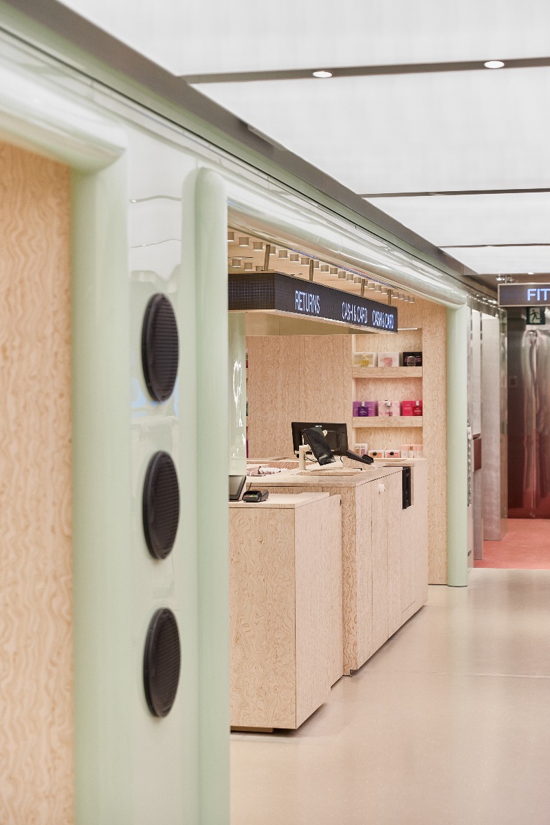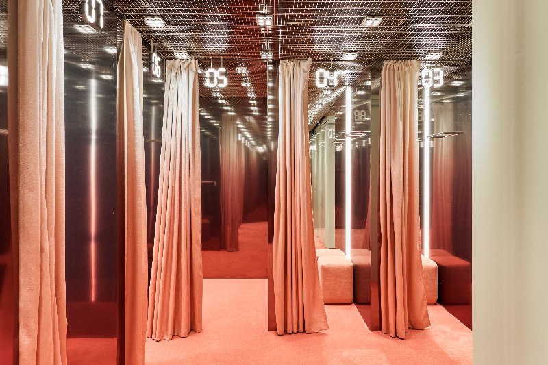 Por su parte, en la zona de hombre, aunque la superficie es mucho menor, esto no afecta en absoluto. Gracias a la gran doble altura, el espacio adquiere una presencia monumental que, a simple vista, hará que muchos piensen que es incluso más grande que la sección de mujer. Esto se logra gracias a un pilar central, rodeado por mobiliario a medida, que potencia una estética escultórica muy coherente con el resto de la tienda de Bershka. Además, si la zona de probadores para mujeres es de color rosa, para el hombre se utiliza luz verde. Un color diferente, pero con el mismo carácter interactivo.
