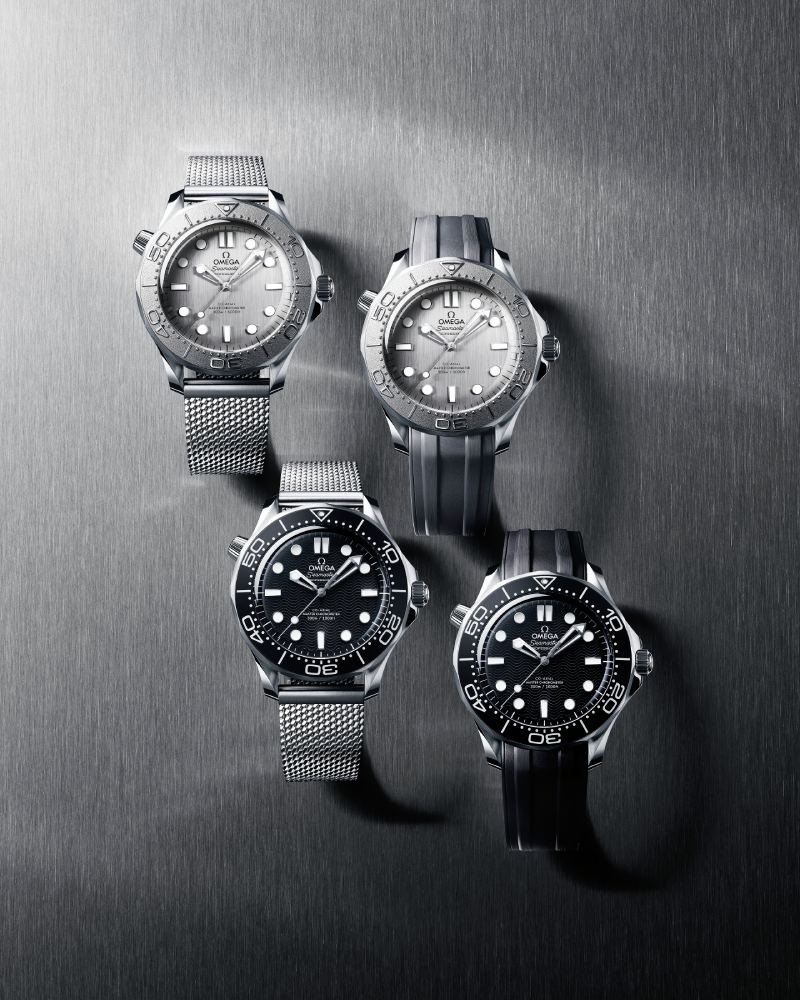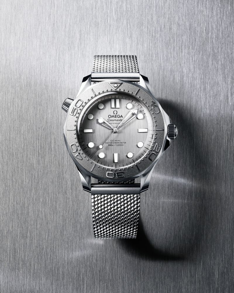 La otra mitad de los nuevos modelos del Omega Seamaster Diver 300M para 2024 apuestan por un look más monocromático. Internamente son iguales, lo único que cambia es el bisel, que ahora es de titanio de grado 5 y la esfera plateada, que se hace de hacer con tratamiento PVD. De igual manera, se incluye un cristal de zafiro abovedado que permite un perfil más delgado. También, encontramos un modelo con brazalete de malla milanesa y cierre desplegable como interpretación más moderna del Diver de 007. Y, también con una versión más deportiva, tenemos una referencia con correa de caucho, pero esta es gris para seguir con el look ultra metálico de la pieza.