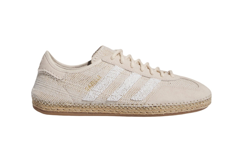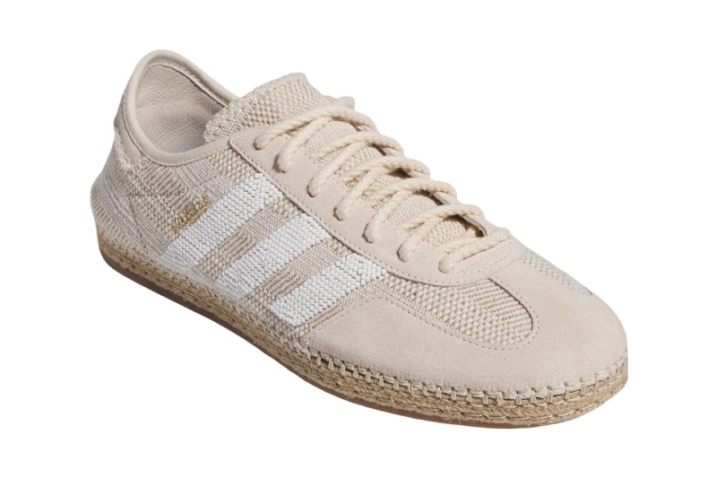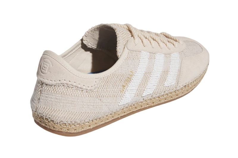 En términos de construcción, el upper de las nuevas Gazelle de Clot se hace con punto textil. Se hacen con yute trenzado, para ser más específicos. El color de este material se deja al natural para un look neutral y muy timeless, que va de maravilla con los detalles reeditados. Las tres bandas laterales, usualmente de cuero, se hacen ahora con cuentas blancas de aire artesanal. Reforzando este punto, las costuras se presentan más gruesas y el cuerpo en general se despoja de mucha estructura. Cerrando este look, tenemos una salpicadera de ante en el mismo tono, cordones de cuerda y un logo CLOT en la talonera, también de ante.