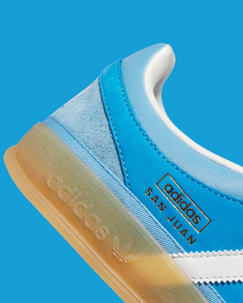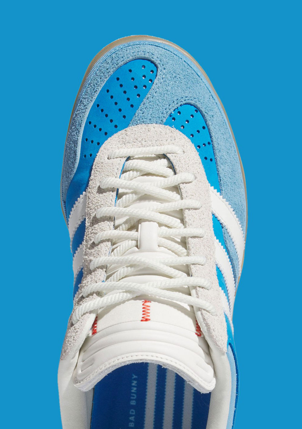 En cuanto a construcción, las nuevas Gazelle San Juan presentan una base de ante aged en azul claro, que contrasta con un súper panel de nubuck más vibrante y un foxing textil. Y por si este update al diseño no fuese suficiente, Bad Bunny ha rediseñado la icónica puntera de las Gazelle con una construcción asimétrica, dándole un look único al nuevo modelo. El empeine referencia a modelos de archivo con una lengüeta de piel acanalada y un panel de ante, ambas en blanco. A juego, tenemos las tres bandas en los laterales y un logo nostálgico de adidas en dorado, subrayadas por “San Juan”. Y no, no es un error de fabricación: la etiqueta de las tallas viene en el exterior.