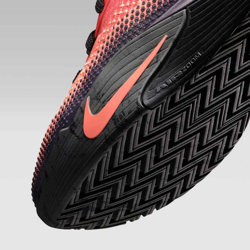 La suela, también ultra performance, convierte a la Nike St Flare en una zapatilla capaz de desempeñar en cualquier tipo de cancha. Esta construcción de goma inyectada esconde una mediasuela de espuma CushIon 3.0 en combinación con una cámara de Air Zoom en el talón, garantizando una amortiguación excepcional. También tenemos una caña de Tpu oculta para mejorar la estabilidad en movimientos laterales. Y, para tener ese agarre perfecto para cortes agresivos, la suela de construye con un patrón de maxi espiga.