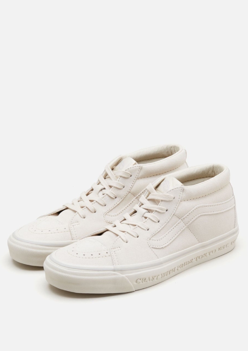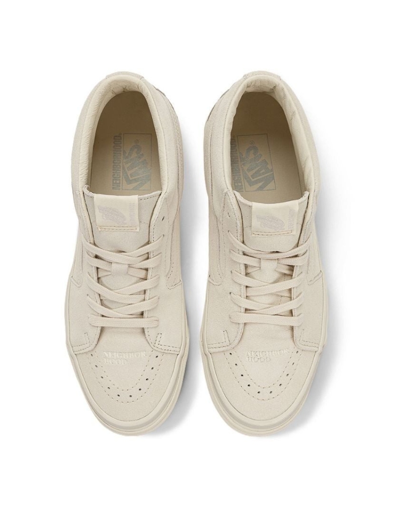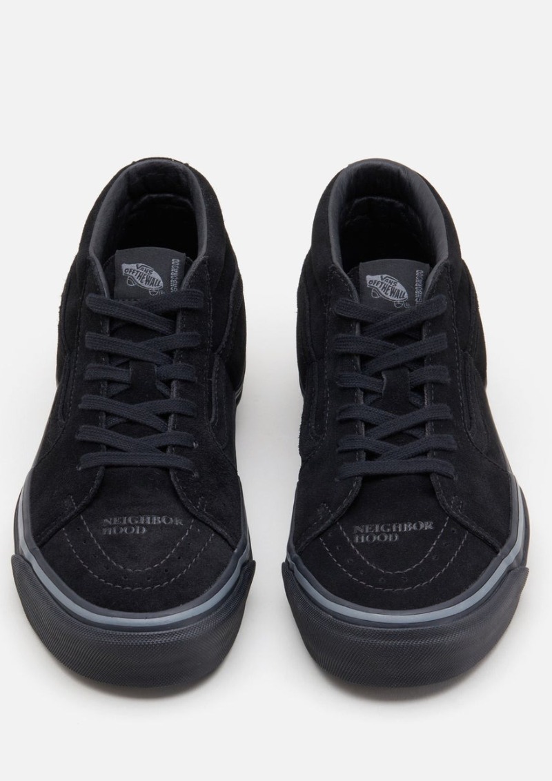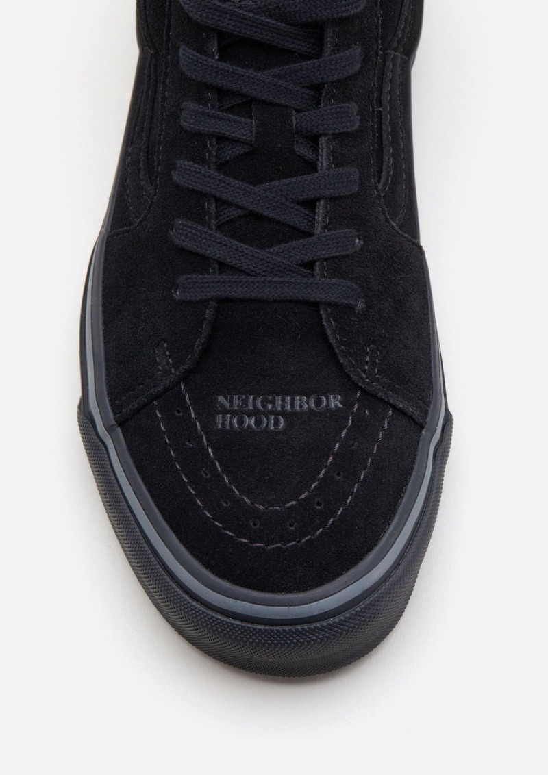 Oficialmente, la denominación de este modelo colaborativo de Neighborhood X Vans es Sk8-Mid 83 DX. Estas últimas letras, que significan deluxe en el léxico Vans, nos indican que se trata de un upper construido con materiales muchísimo mejores que el resto. Estas versiones se presentan con un cuerpo superior de ante con detalles de piel en el mismo color, se ofrece una versión negra y una color crema.