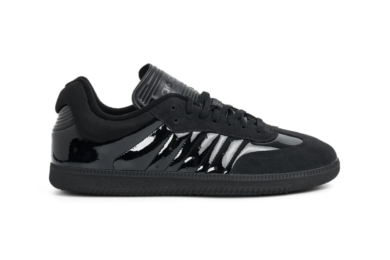 Pero la elección y disposición de los materiales también ha cambiado en la versión de adidas X Dingyun Zhang. Su modelo rescata un upper que combina un cuerpo de piel acharolada negra y brillante con materiales de menos brillo. Los refuerzos de ante del modelo og se mantienen, respetando la paleta monocromática de la zapatilla. Las tres bandas laterales se mantienen como detalle vestigial a través de una sección acolchada y cosida, además de perforaciones para ventilación.