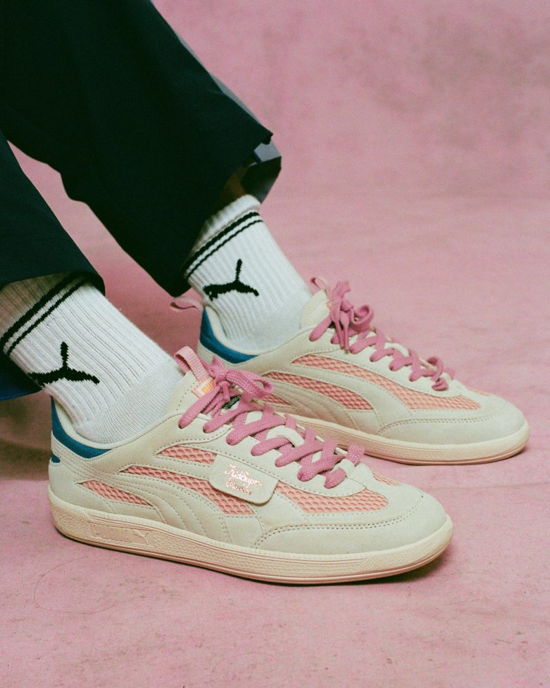 Abriendo esta cápsula de Puma X KidSuper FW24, tenemos dos nuevas reinterpretaciones de Dillane sobre algunos de los hits más grandes de la firma alemana. En primer lugar, tenemos unas Palermo completamente rediseñadas que apuntan a ser una de las mejores siluetas statement de la temporada. En el upper, tenemos un cuerpo superior de cuero blanco hueso deconstruido, que deja ver una estructura de mesh rosa por debajo y a juego con los cordones. Como punto de acento, las taloneras se pintan de verde y el medial se decora con un tag exclusivo a la colaboración.