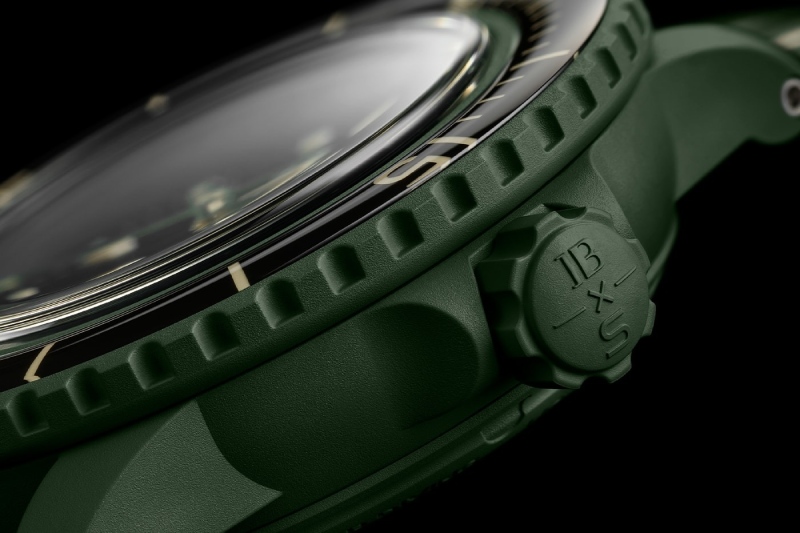 La estética del nuevo Green Abyss es lo que sí cambia con respecto a los otros modelos. Dentro, nos encontramos un dial verde oliva matte, acentuado por indicadores diver de aire clásico y agujas a juego, también con tratamiento luminiscente. Y, como guiño a los modelos originales de archivo, este reloj presenta un indicador de contacto con el agua a las 6 en punto. En el reverso, como de costumbre, vemos un diseño de caja abierta con un nudibranquio (este es el Felimare picta).