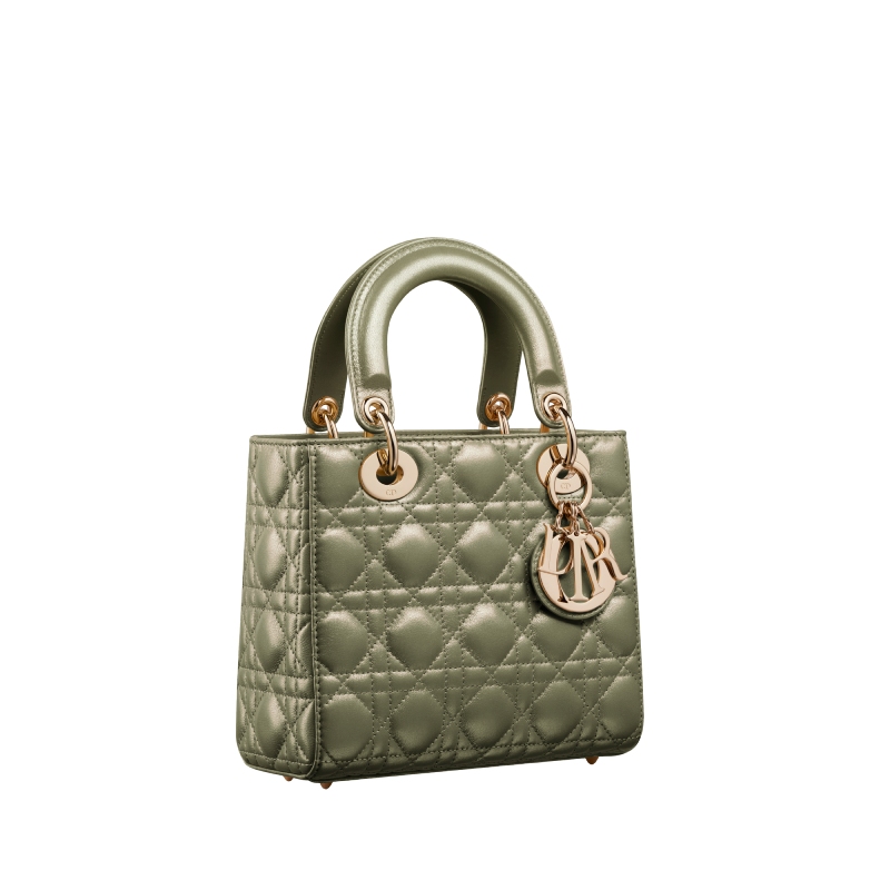 El Lady Dior Glossy retoma las líneas gráficas del Dior Cannage. Se trata del patrón inspirado en las sillas de Napoleón III en las que Monsieur Dior sentaba a las invitadas de sus desfiles. Ahora, este mítico motivo se presenta en espectaculares tonos pastel en azul noche, rosa, verde y amarillo. Hardware metálico en dorado se encarga de decorar y acentuar las líneas y colores del bolso, junto con el mítico charm de Dior que cuelga de una de las asas.