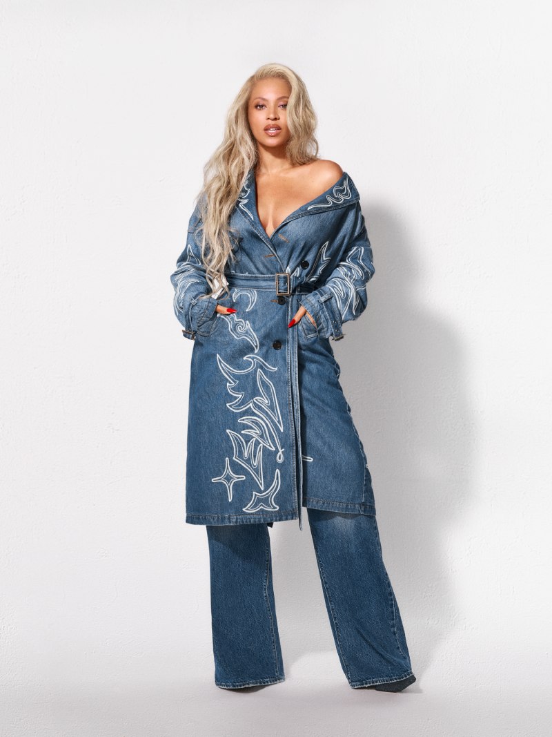 El look con el que vemos a Queen Bey en la nueva campaña de Levi’s X Beyoncé es una pieza única, personalizado con detalles de pedrería y tribales de inspiración western. Sin embargo, las prendas que conforman este look son parte de la nueva colección de la firma. Como pieza más statement, tenemos la gabardina vaquera Spade, que combina el corte clásico de una trench con una construcción denim de lavado medio súper moderna.
