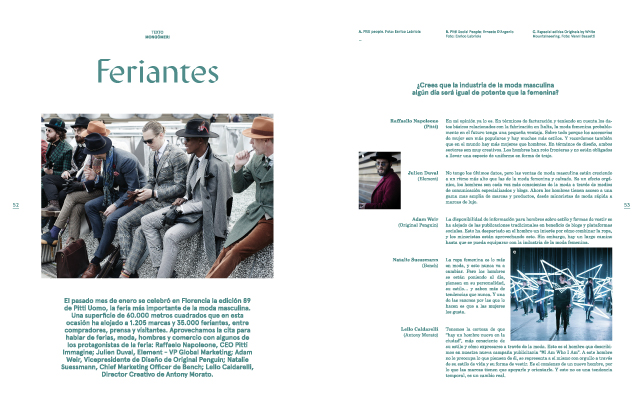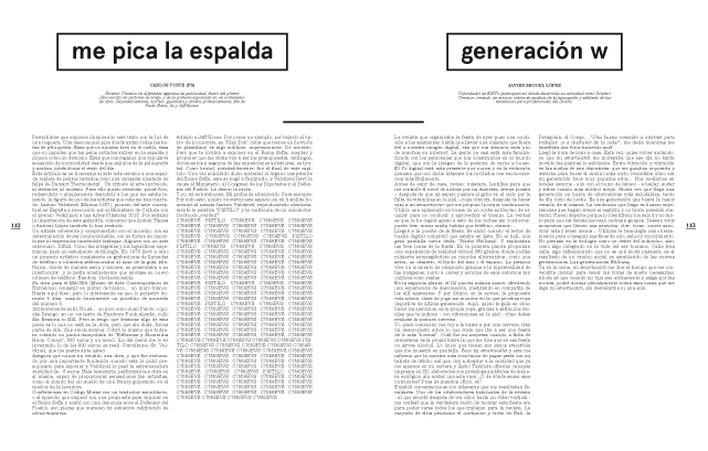 Y por último, las páginas de opinión, reflexiones siempre interesantes y enriquecedoras de profesionales de la creatividad, en sus múltiples variantes, sobre el mundo que nos ha tocado vivir. Pequeñas master class de cuatro mil y pico caracteres con titulares tan sugerentes como “me pica la espalda”.
