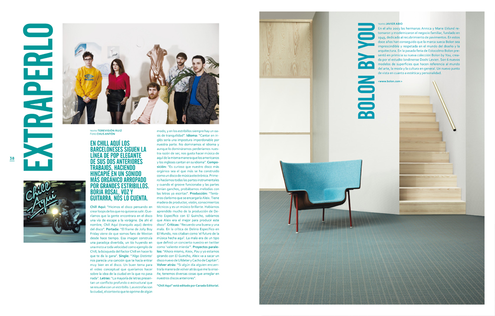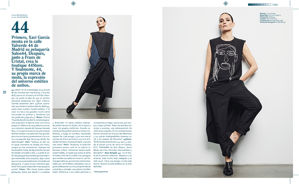 En la sección Neos, esa que todos conocéis por servir de plataforma a nuevos creadores, ya sean de música, moda, arte o diseño de producto, os ofrecemos entrevistas con artistas como: el músico Meilyr Jones, antes líder de Race Horses; Rafa Bodgar y Esperanza Berrocal, los creadores de Chromosome Residence, una nueva marca conceptual de ropa con base en Madrid que nace con la intención de hacer cosas realmente nuevas; A.Guery, joven diseñadora francesa que después de pasar por firmas como Christian Dior, Balenziaga o Cacharel, se lanza a la aventura de crear su propia firma; Cala Vento, el dúo español presentan su álbum debut con el que se van al festival de SXSW de Austin; Låpsley, joven artista de 19 años que pública su primer álbum, una mezcla de chill electrónico, r&B, electrónica y sonidos experimentales que está cautivando al mundo; Marie-Sophie Beinke, el último gran nombre recién salido de la Royal Academy of Arts; Isometric, firma catalana ganadora del premio a la mejor firma emergente en 080 Barcelona Fashion; Xavi García y Franx de Cristal nos presentan, con laura Ponte de modelo, su nueva aventura textil, 44, descubrelo en el pequeño emporio que están construyendo en la calle Valverde de Madrid.