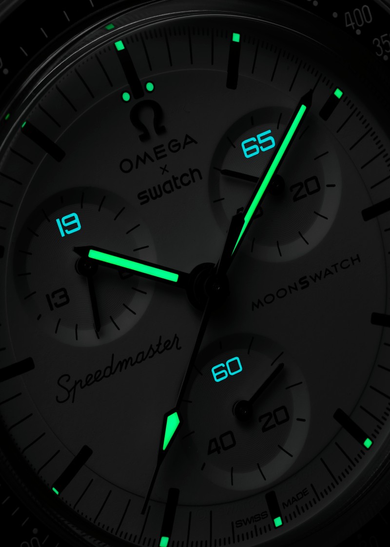 Lo especial del MoonSwatch 1965 lo encontramos en sus looks. Comenzando por la esfera, tenemos un dial blanco inspirado en el Speedmaster Professional que salió el año pasado. Y las subesferas del crono también tienen algo muy especial. El contador de horas llega solo hasta la 19; y el minutero llega hasta los 65 minutos, para sumar el año de la certificación. Aparte, estos números se recubren de Super LumiNova azul, a contraste del verde de los demás indicadores.