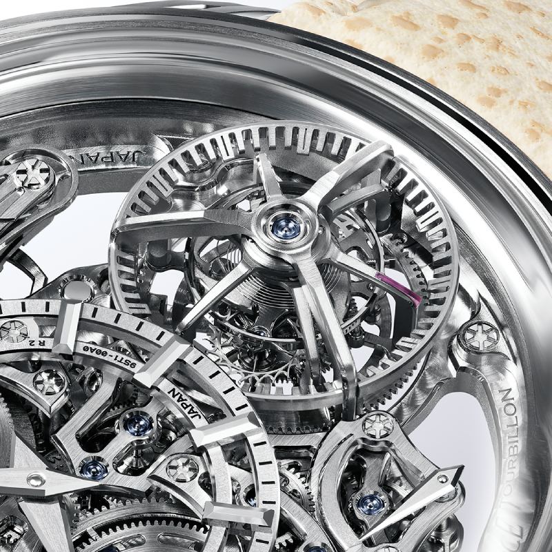 Este Grand Seiko Kodo Constant Force Tourbillon, al igual que el original, presenta un dial superior donde se consulta la hora. Siguiendo el ADN clásico de la firma, los indicadores son facetados y minimalistas, al igual que las agujas triangulares. Rematando el look, el reloj se acompaña de una correa de piel de becerro, especialmente tratado como las armaduras de los samuráis. Y si el blanco no os convence, también viene con una de piel de cocodrilo en antracita.