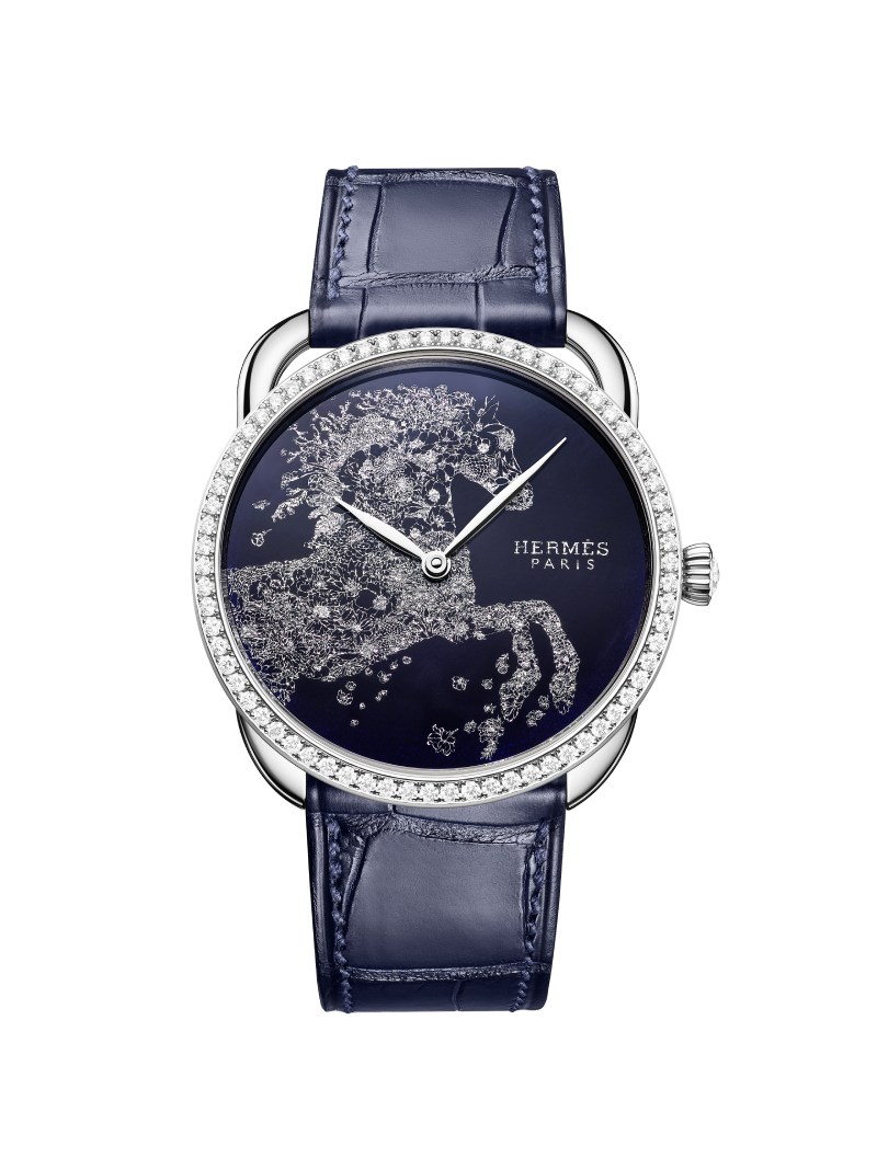 Pero la magia está en su esfera que muestra una representación fiel del motivo Robe Légère a través de una técnica artesanal extremadamente rara. El dial del Hermès Arceau Robe Légère se hace con esmalte pailloné, compuesto de una capa oscura hecha de polvo de vidrio coloreado, molido y mezclado con aceites naturales. Una vez seca esta capa, un artesano recrea el diseño ecuestre y floral con delicados pallones de pan de plata. Luego, se recubre de una segunda capa de esmalte y se pasa por horno, creando así una composición de capas y texturas espectacular. Y, a juego con el dial esmaltado, la pieza se acompaña de una correa de piel de aligátor en azul abisal.