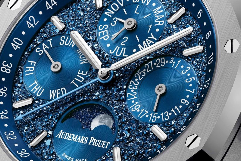 El nuevo Royal Oak de Audemars Piguet X John Mayer viene con una esfera Crystal Sky. Esta esfera, lograda a través de innovadores procesos de tratamiento de metal, consigue emular una estética de cristales amontonados que brillan con los cambios de la luz. Todo esto se construye en azul. Los indicadores del calendario perpetuo también han sido revisitados, John Mayer cambió el 31 rojo de la fecha por un 31 con el último dígito decantado, para diferenciarlo del 1. Los indicadores multifacetados también se rematan en oro blanco. Cerrando las complicaciones, tenemos también un indicador de fase lunar y un contador de semanas en azul.