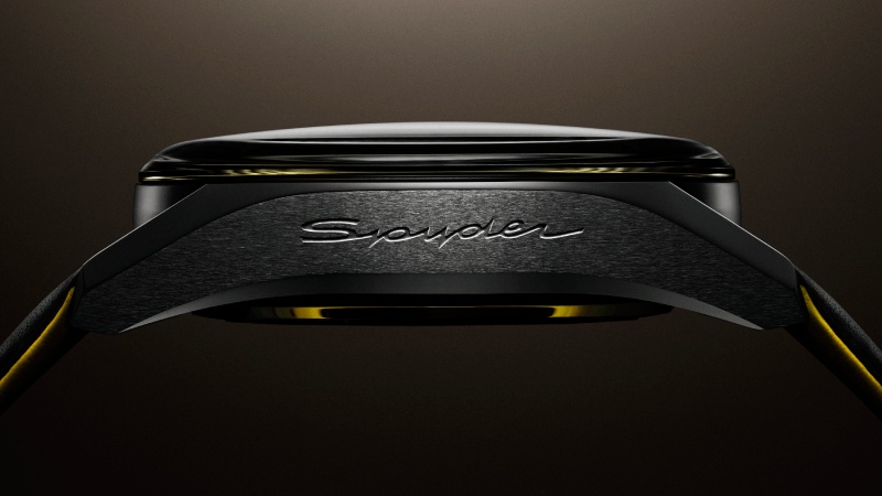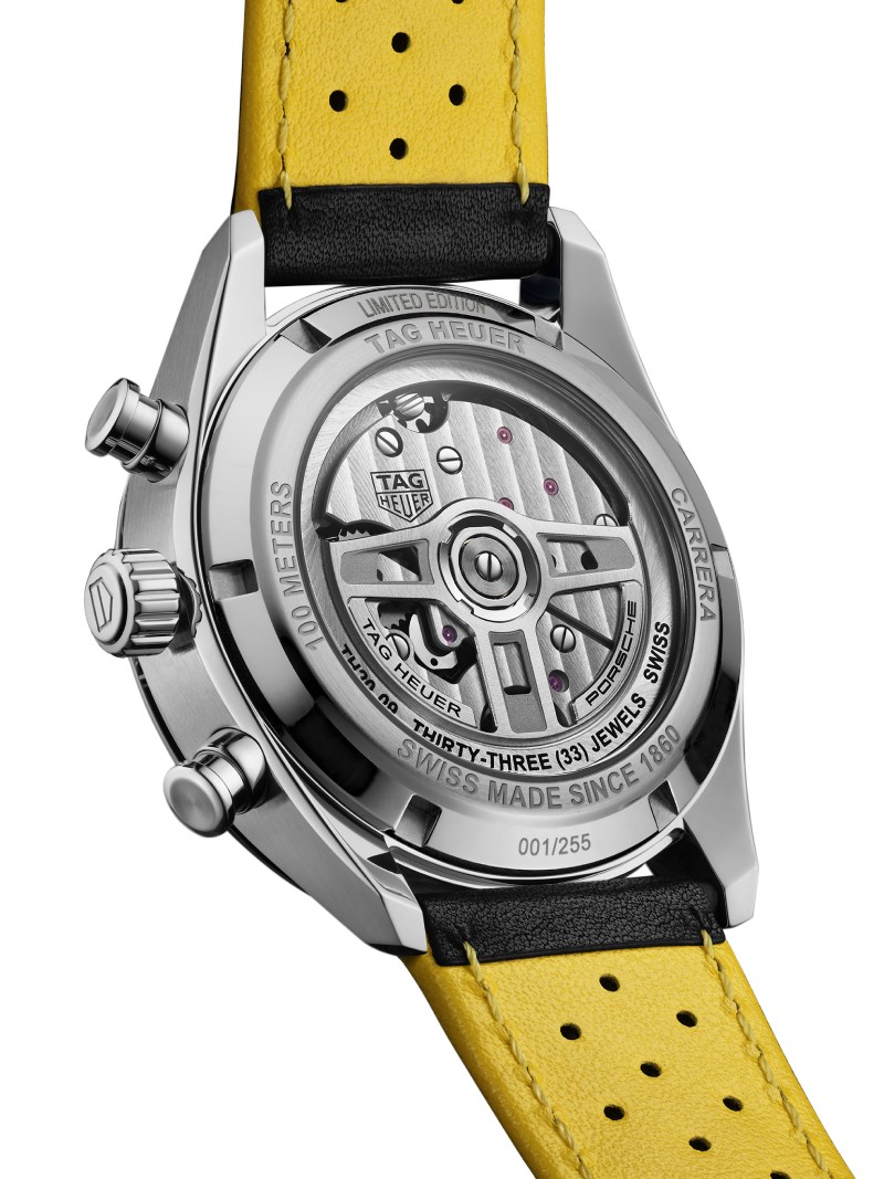 Pasando a las esfera del nuevo Carrrera, nos encontramos con un dial esqueletado que esconde detalles muy interesantes. Por ejemplo, la forma de lo esqueletado se inspira en las ruedas del 550 Spyder. Y, ¿qué hay de los detalles en amarillo? Pues son sacados de la librea original del coche: plateado, negro y amarillo. Reforzando este punto, tenemos una aguja de segundero lacada en el mismo tono, a juego con las demás agujas del chrono y los indicadores horarios. Todo esto se enmarca en un bisel bajo cristal Glassbox con el logotipo de Porsche y la inscripción Panamericana sobre el Tourbillon. Rematando el look, tenemos una correa de piel perforada negra, con detalles a contraste en amarillo.