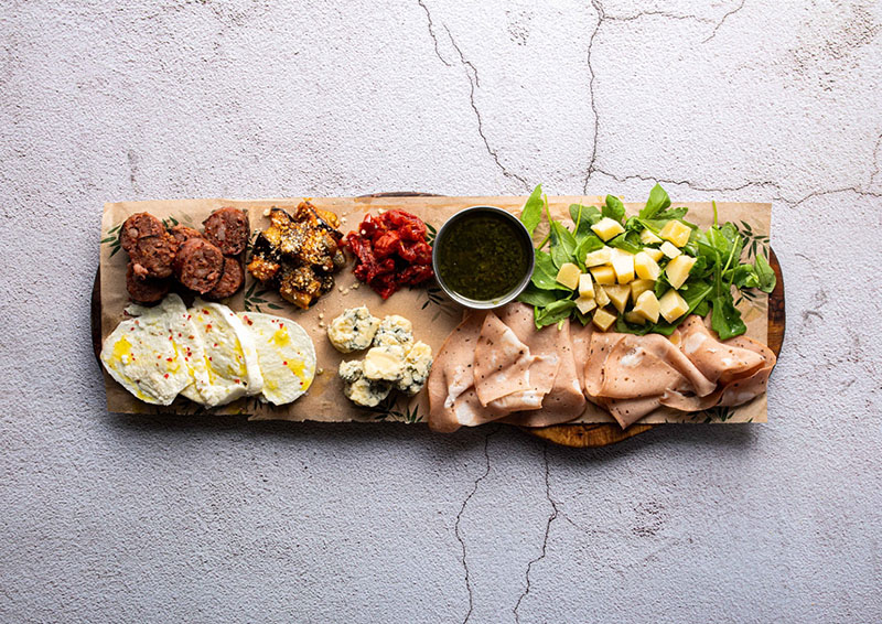 Aunque la carta de Restaurante Ôven Mozzarella es extensa, hay recetas que concentran buena parte de la personalidad de la casa. Uno de los entrantes más representativos es La Tavola, una tabla generosa de embutidos y quesos italianos -como la bresaola, el jamón de Parma o el gorgonzola- que se acompaña con straciatella de burrata, nueces, dátiles y pan redondo.