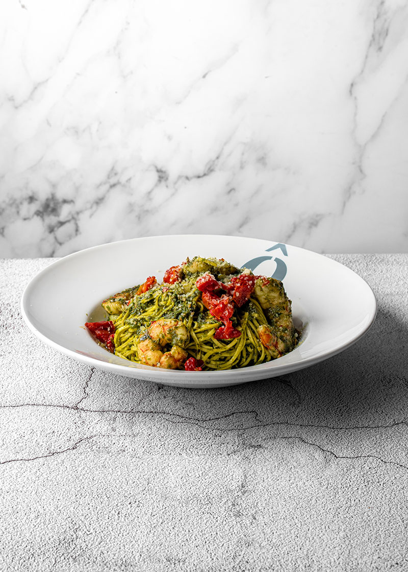 Linguini de gambón rojo al pesto