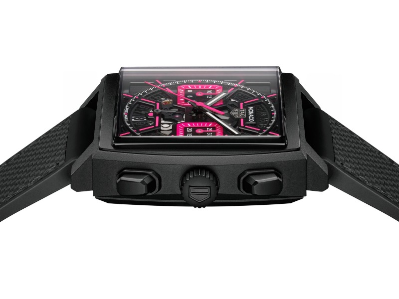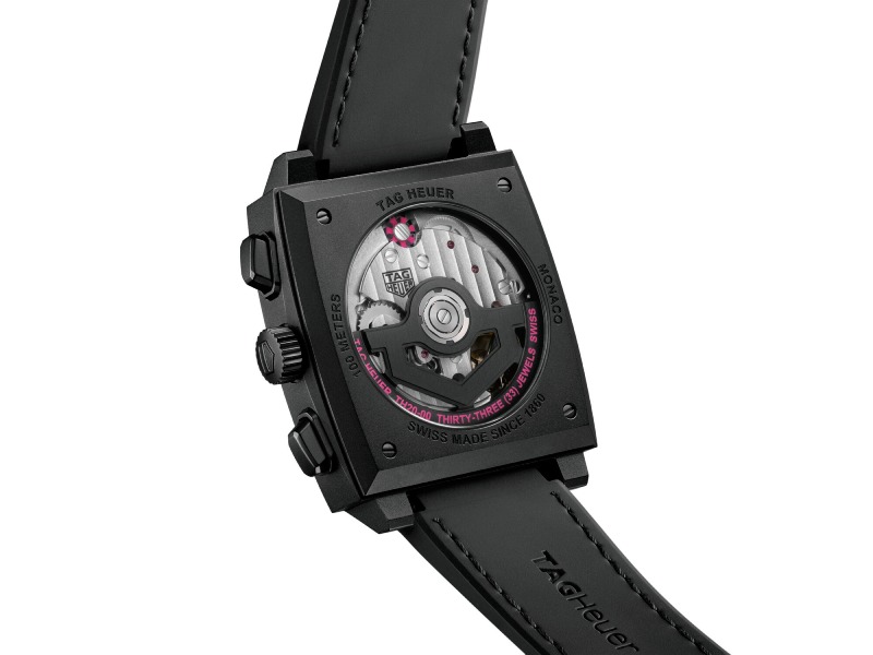 El reverso de la caja mantiene el mismo estilo neón y futurista. Si volteamos el Tag Heuer Monaco Las Vegas Grand Prix, nos encontramos un diseño de caja abierta con ventana de zafiro que deja ver la masa oscilante, negra y con acentos rosa neón. Complementando el look, tenemos una correa de caucho y piel recubierta de material textil completamente negra, a juego también con el cierre desplegable.