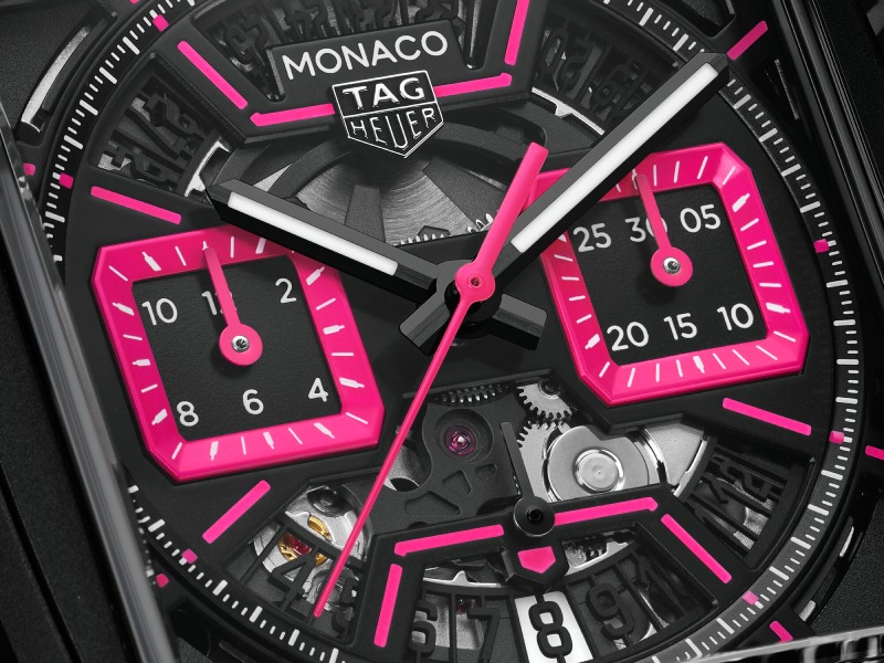 La esfera del Monaco de Las Vegas también cambia las cosas respecto al modelo original. Esta versión presenta un dial esqueletado que permite ver el mecanismo y el movimiento rotativo del disco de los números de la fecha. Si no sabéis donde está la fecha correcta, hay una flecha en la sexta posición que la indica. Acentuando esta composición, tenemos el contador de 12 horas y 30 minutos enmarcados en rosa neón, a juego con los indicadores de horas (con diseño revisitado y minimalista) y la aguja del segundero.