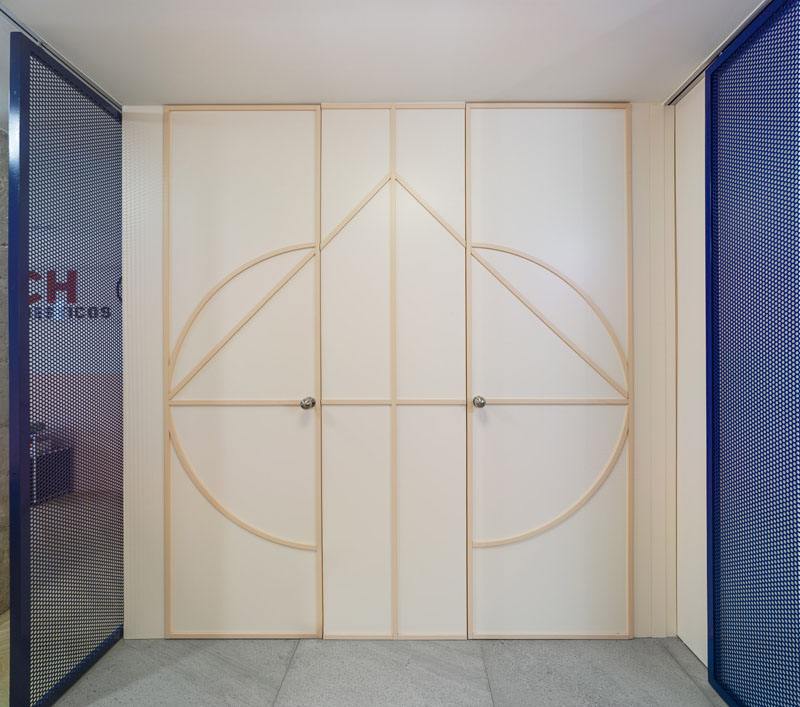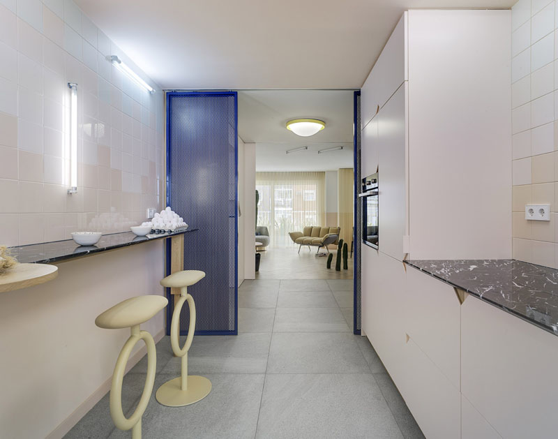 Nos encontramos con un interiorismo muy funcional pero que a la vez tiene mucho de escenográfico. Se ha usado pavimento cerámico (instalado en baños, cocina, hall y terraza), y la madera (en salón y dormitorios) . Algunos tabiques de chapa perforada son elementos divisorios móviles que hacen que el espacio se transforme en función del uso.