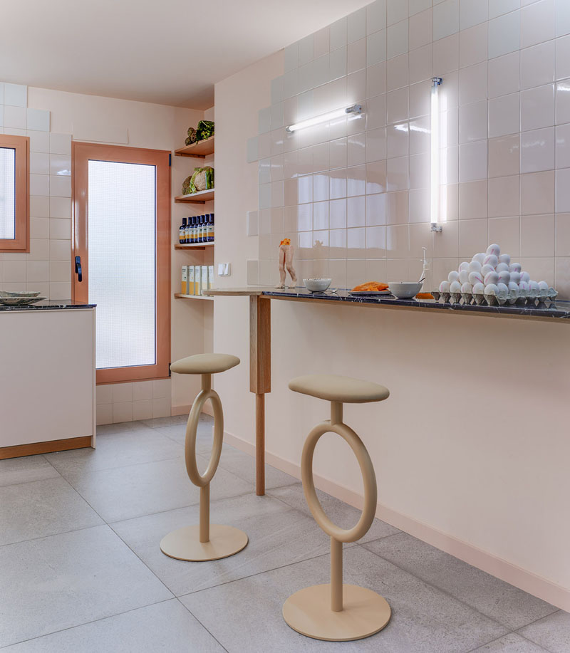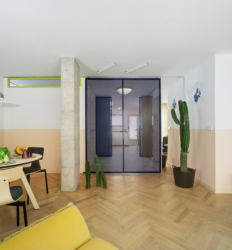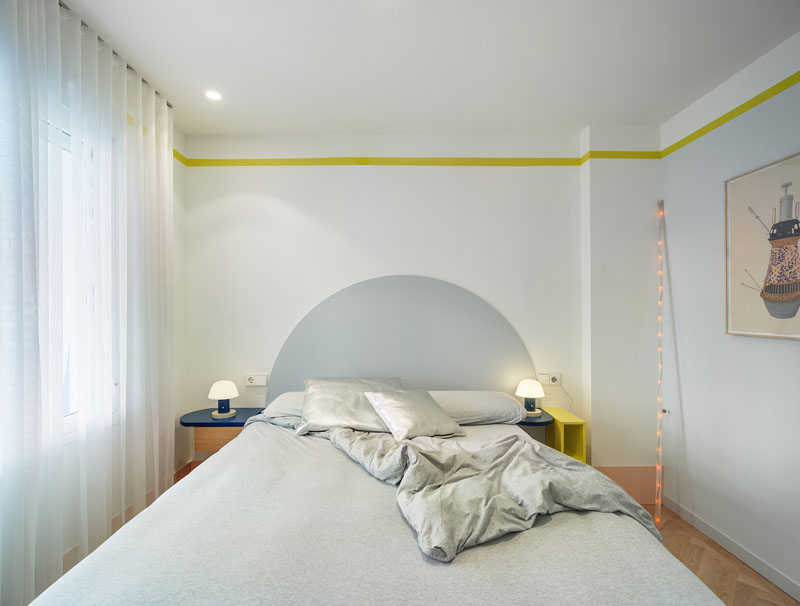 El color es también protagonista, remarcando los contrastes que refuerzan las perspectivas y dan continuidad a los elementos arquitectónicos. En la zona interior, en los dormitorios, domina el blanco. En el exterior se invierte la proporción, con rosas, azules, gris y amarillo como tonos dominantes. Como recursos constructivos se han seleccionado materiales nobles: madera y piedra, combinados con acabados industriales en la iluminación y puertas. Se han usado dos tipos de pavimentos, madera de roble colocado en espiga y cerámico. Este último se ha utilizado también como revestimiento vertical y está muy presente en la cocina y baños. Número 26 recicló también los vidrios de las mamparas de las oficinas de los años 70 para las puertas de los dormitorios, que hacen la función de tragaluces aportando luz natural al pasillo.
