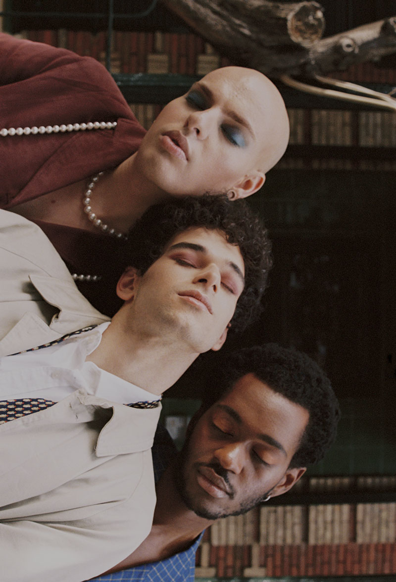 Foto Arriba (De izquiera a derecha): Flavio lleva americana de segunda mano + Pañuelo vintage + Broche multicolor de Swarosvki + Pantalón de Nestor Rodriguez + Zapatos de Carmela. Claudio lleva traje de Nestor Rodriguez + Collar de Swarosvki + Zapatos de Carmela. Megane lleva collar de Swarosvki + Perlas vintage + Collar de perlas vintage + Americana y pantalón de Nestor Rodriguez + Bolso de Loewe.