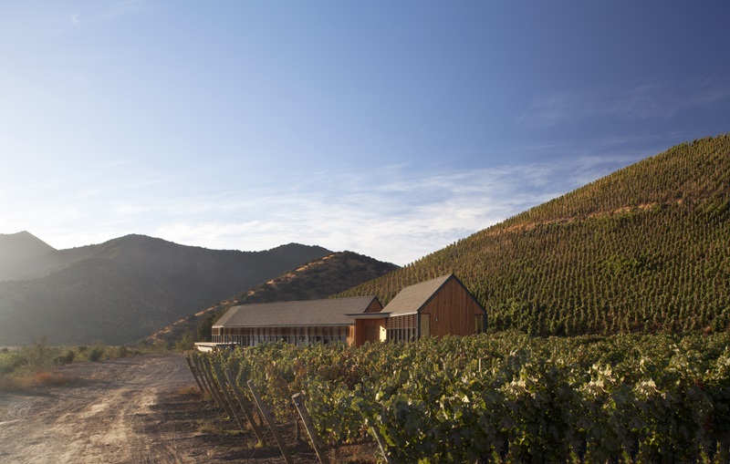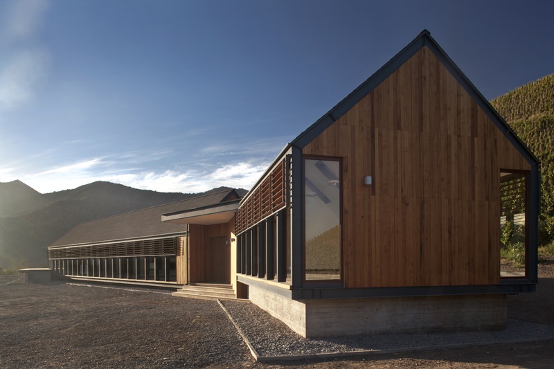 Tras un cuidadoso estudio del entorno, el equipo de Claro + Westendarp Arquitectos decide emplazar la construcción al pie de los cerros que salpican el territorio sur de la región metropolitana de Santiago. De tal modo, que la parte opaca del volumen se orienta hacia la elevación montañosa, mientras que la acristalada se abre en la dirección opuesta, ofreciendo una panorámica del hermoso paisaje modelado por el viñedo.